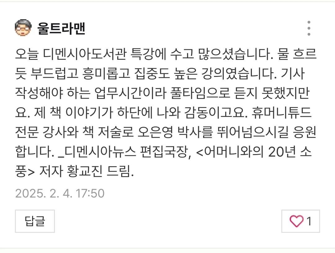 디멘시아 편집국장님이자 작가님이 휴머니 튜드 강의 1회차 블로그 후기에 댓글을 남겨주셨다.
