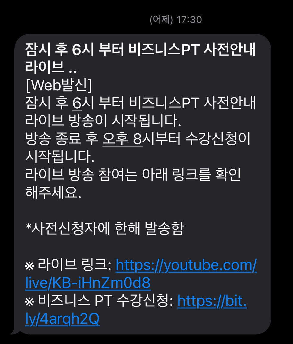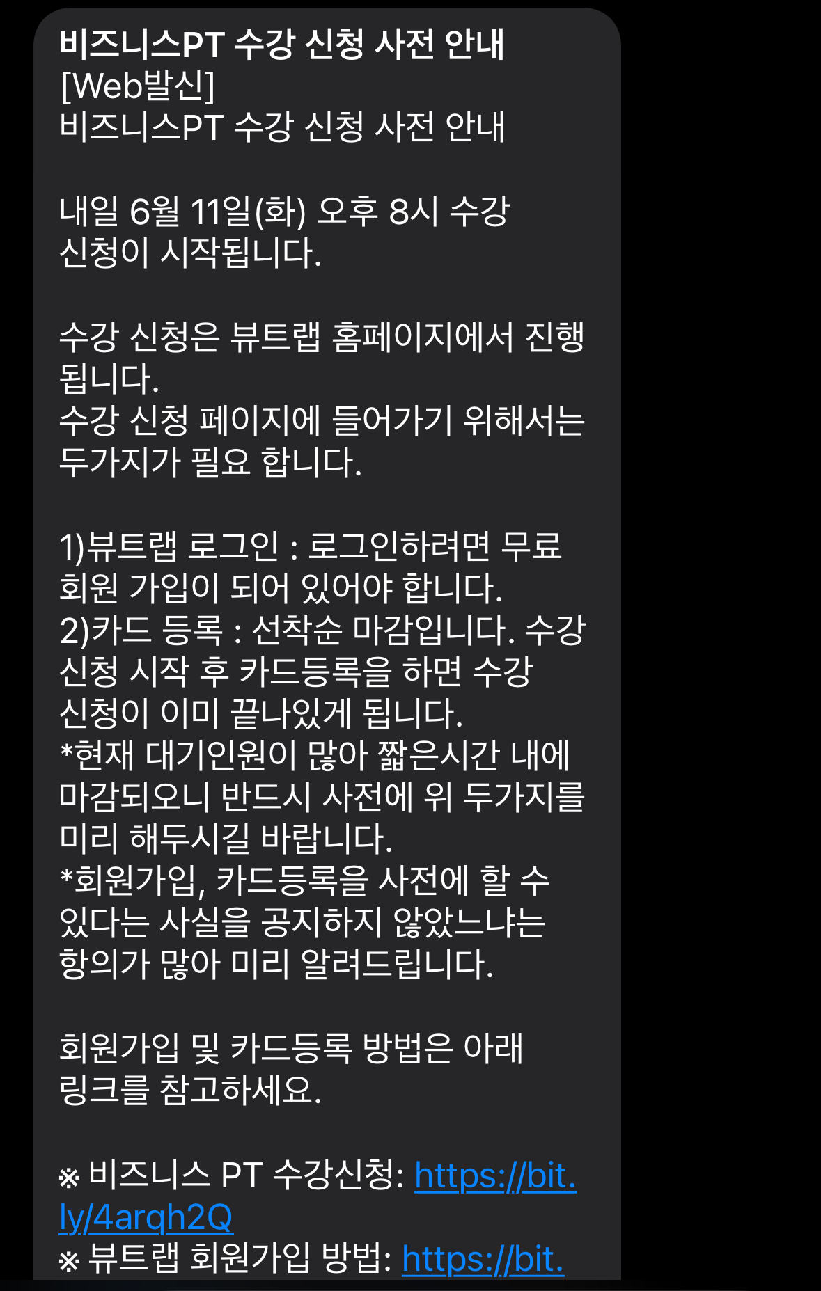 그리고 저 비즈니스 PT 수강신청 링크를 잘 저장해두었다가 수강신청 당일 PC에서 접속하고 대기하면 된다.