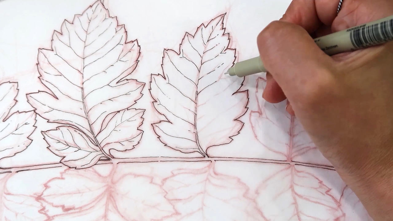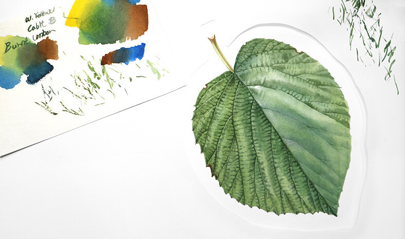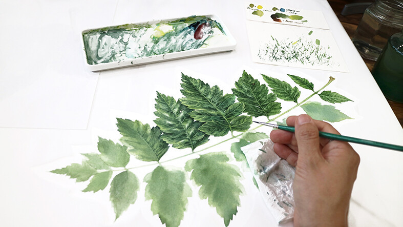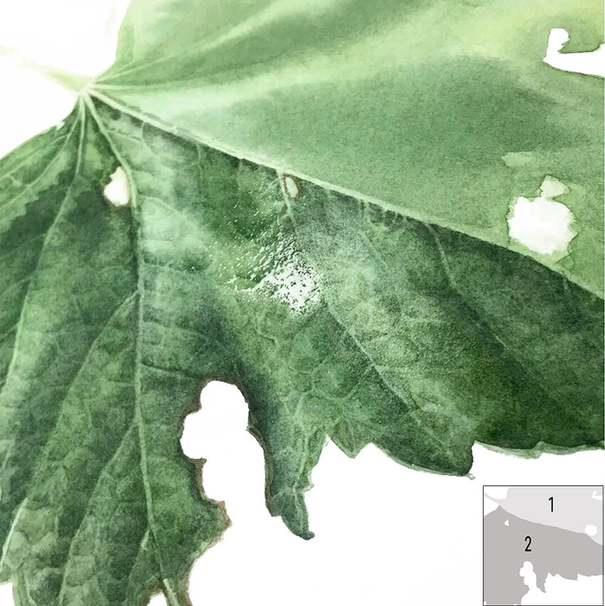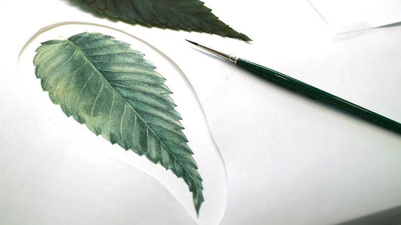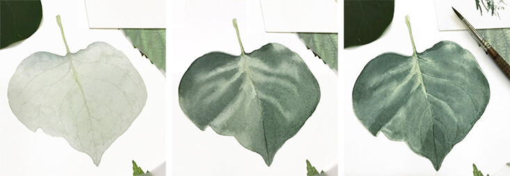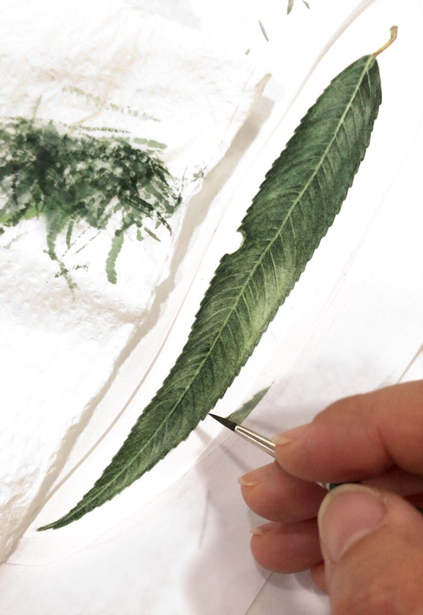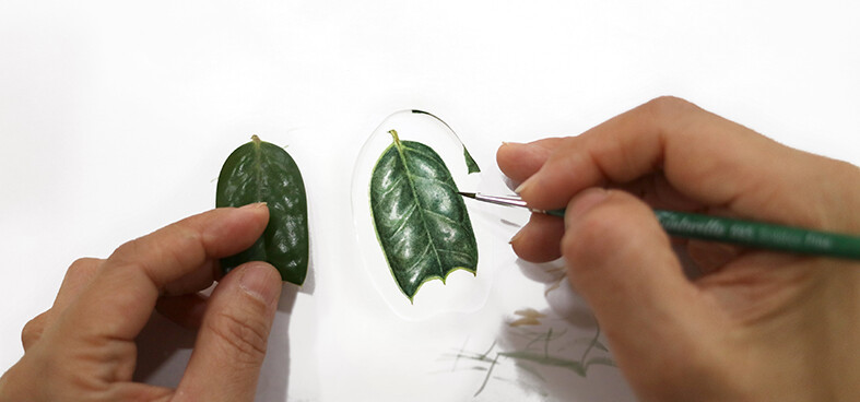 2. 번지기로 칠한 밑색이 완전히 마른 후에 필요한 부분에 부분 번지기로 색을 더 올린다. 그리고 세필 붓으로 마른 붓질(물기가 적은 붓질)을 해주며 잎맥을 살려주고 원하는 결과가 나올 때까지 반복적으로 명암과 질감을 나타내 준다. 섬세한 마른 붓질은 마치 뾰족한 연필로 세밀한 묘사를 하는 것과 같은 방법이다.