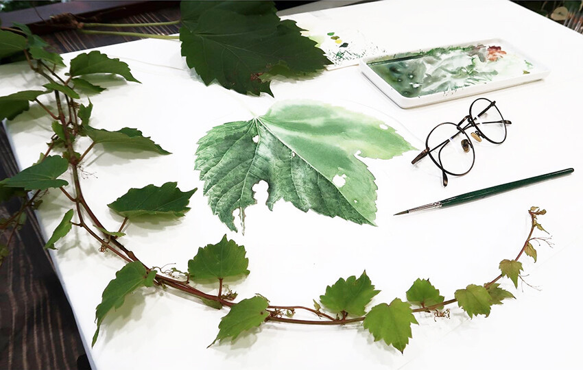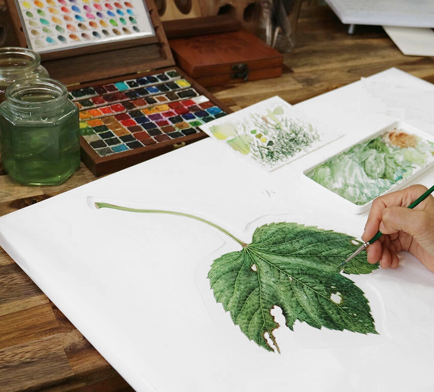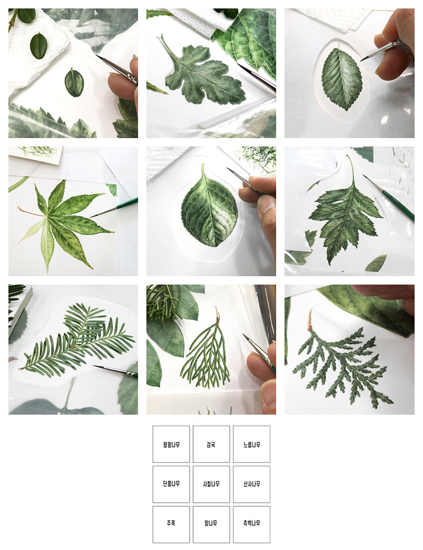 잎의 분위기에 따라 색과 물을 조절해 색을 만들어 낸다.