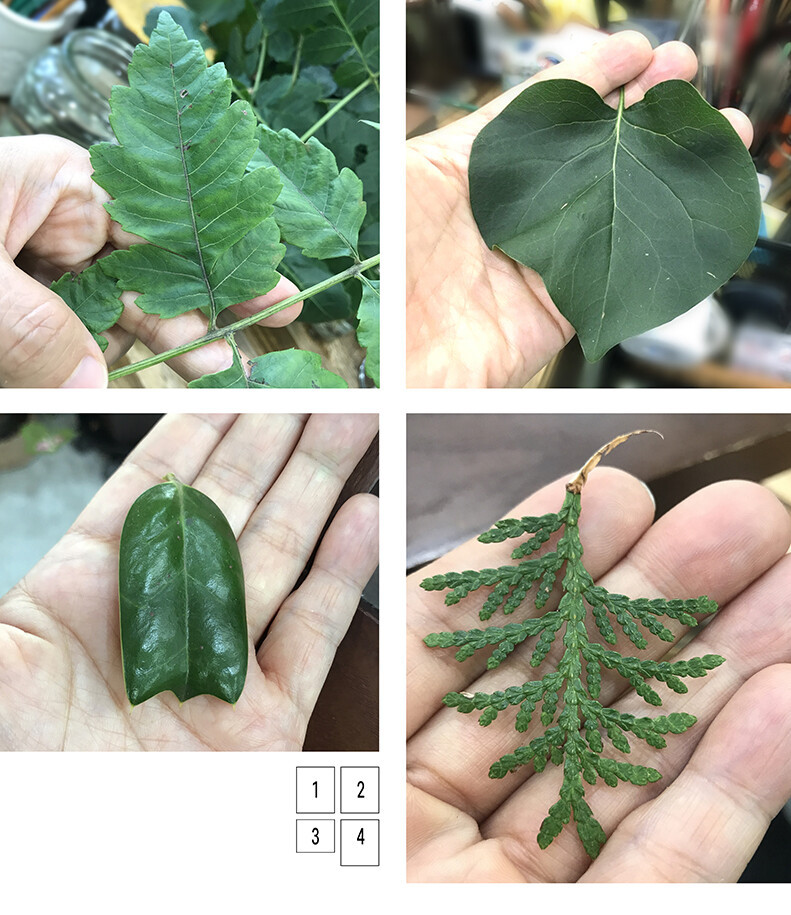 먼저 선택한 잎은 크고, 싱그럽고, 모양도 멋진 담쟁이덩굴 잎이다. 다음은 담쟁이덩굴만큼 크고 시선을 끄는 잎을 찾아본다. 어떤 것은 너무 크고, 어떤 것은 모양이 비슷해서 고르기가 쉽지 않다.