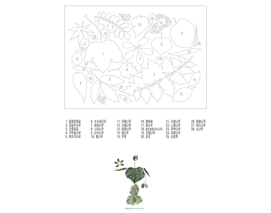 나무에서 바람과 함께 살랑거리는 모습은 편안함과 안정감을 준다. 28개의 잎 그리기는 정말 즐거웠다. 나는 잎 하나마다 이야기를 상상하며 작업과정을 소풍처럼 즐겼고 완성작은 집안의 휴식이 되었다.