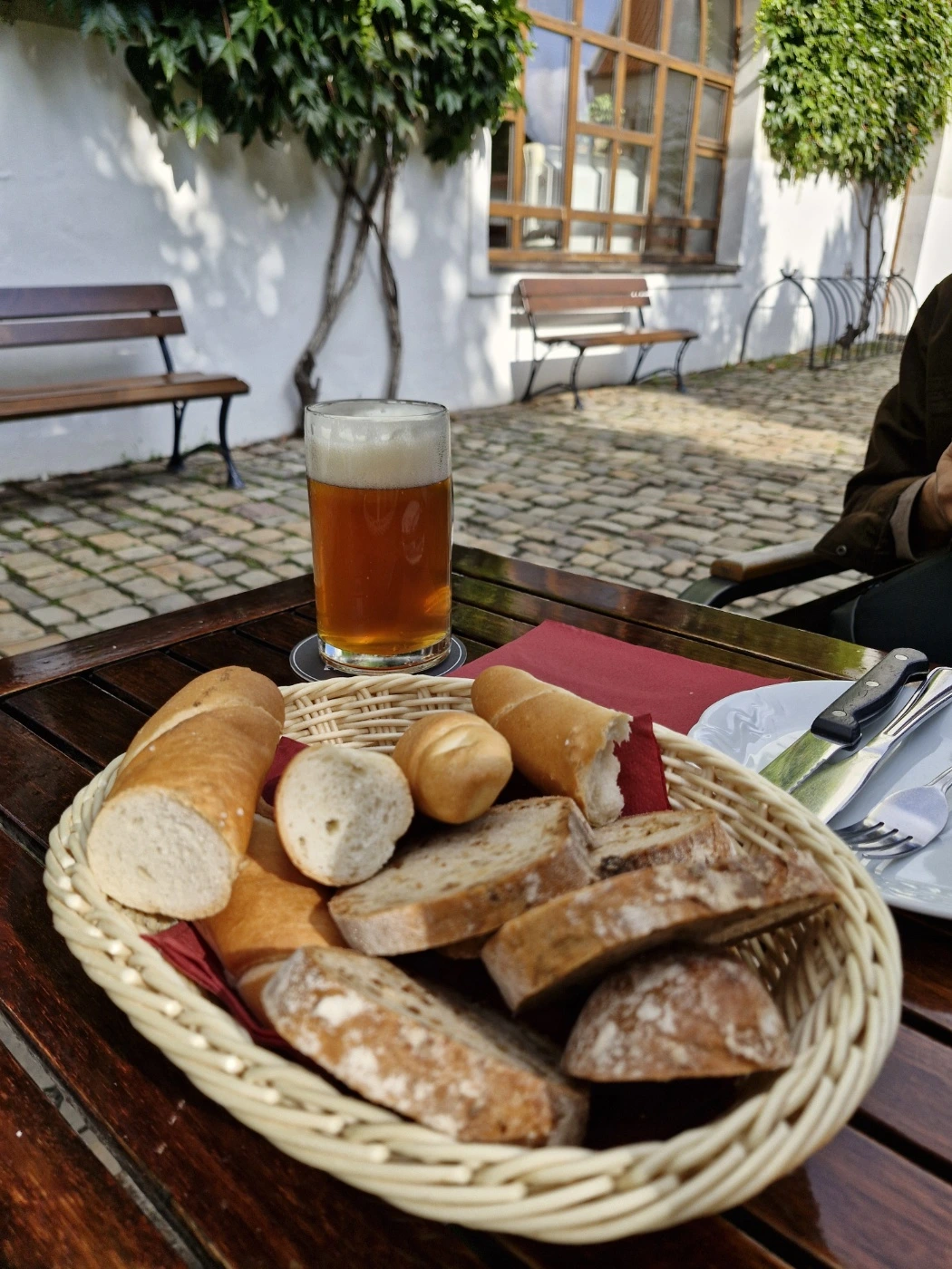 엠버 맥주와 IPA 맥주, 꼴레뇨와 굴라쉬 폭립을 시켜본다. 기본 세팅인 빵이 한가득 담긴 바구니가 먼저 온다. 이럴 줄 알았으면 음식을 덜 시킬 걸.