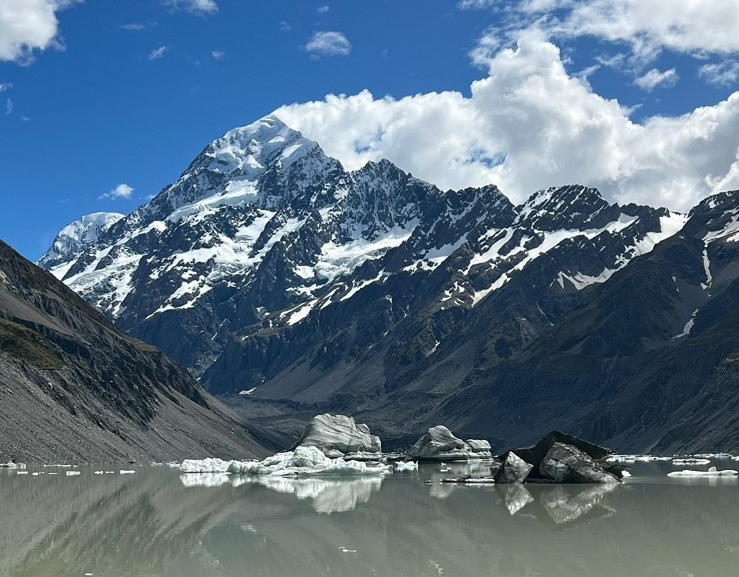 어깨는 무거워도 멋진 트래킹이었다. 트래킹 중간중간에 만난 옥색 개울과 마운트 쿡 바로 아래 석회질을 품고 있는 회색 호수, 그리고 호수 위를 둥둥 떠있는 빙하들.