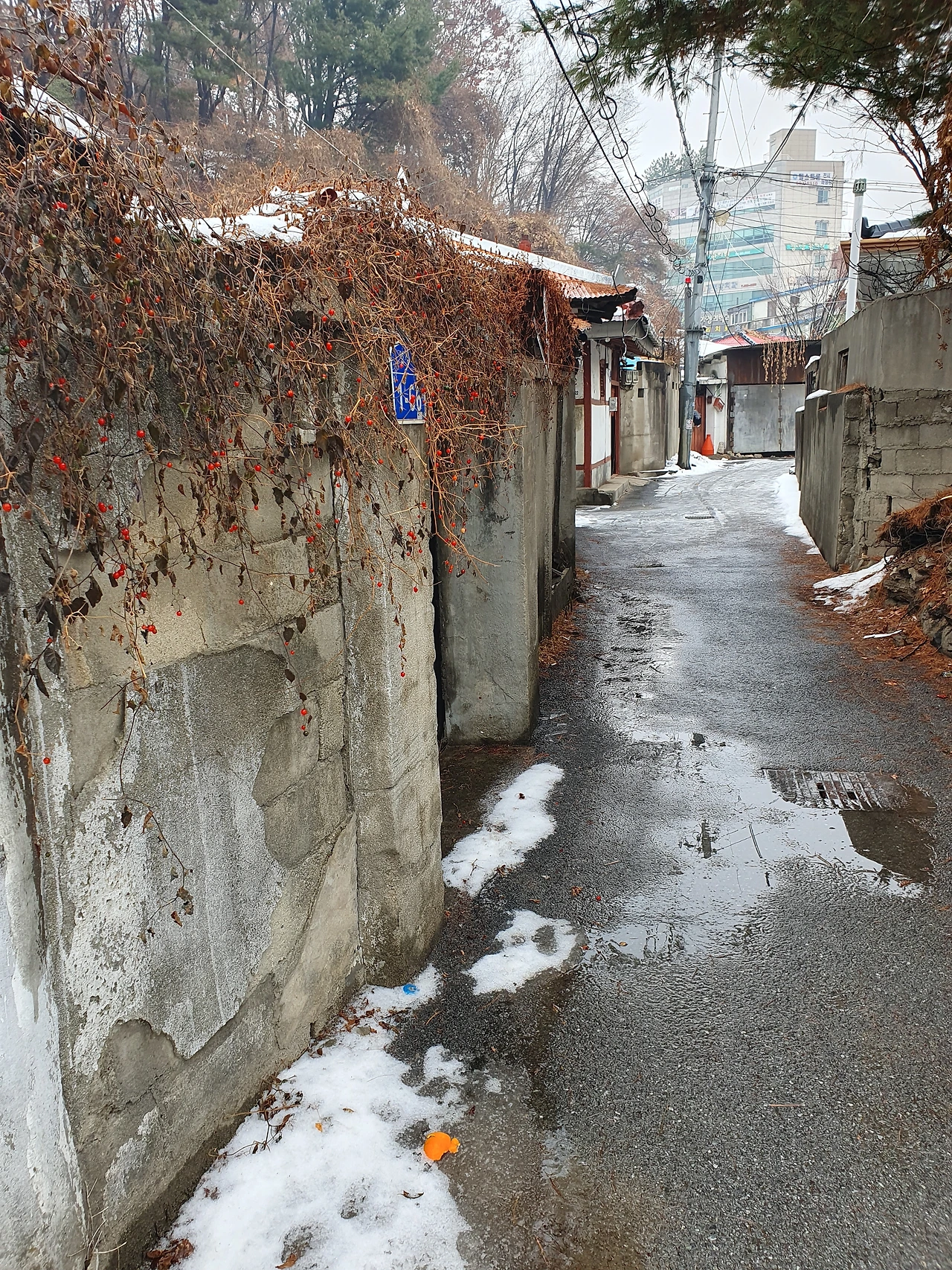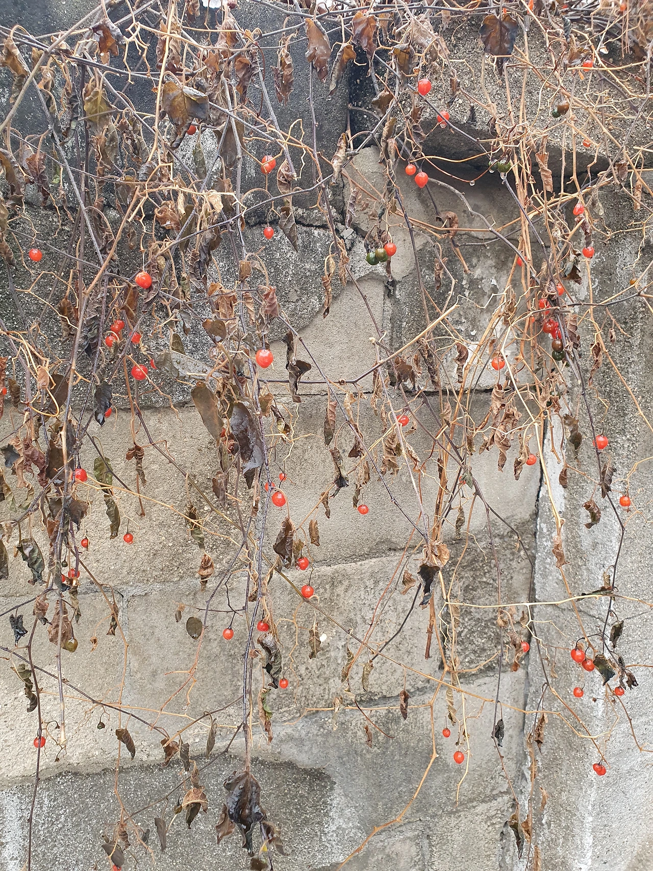 사람이 살지 않는 담벼락에 앵두같이 빨간 열매