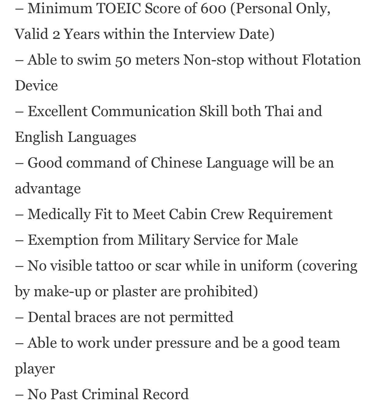 학력에 대한 부분은 비엣젯 항공의 본사인 베트남에서 진행되는 채용과는 조금 다릅니다. 4년제 이상 즉 학사 이상에 학력을 요구하고 있습니다. 이점에 대해서는 외국인 채용이라면 워킹 비자 발급과 관련한 사항이라 볼 수 있겠습니다만 태국 현지인에 대한 채용에서 학사 이상을 요구한다는 점은 분명 승무원이라는 직업 자체의 태국 내 위치를 보여주는 듯합니다. 물론 불과 몇 년 전만 하더라도 국내에서도 승무원 채용 공고에서 키와 학력에 대한 제한을 언급했던 시기가 있었죠. 사회적인 분위기가 변하며 여러 외항사의 채용에서도 키와 학력 등을 직접적으로 언급하여 제한하지 않는 분위기가 형성되고 있으나 해당 채용은 여전히 세부적인 요구 조건을 표시하고 있습니다.