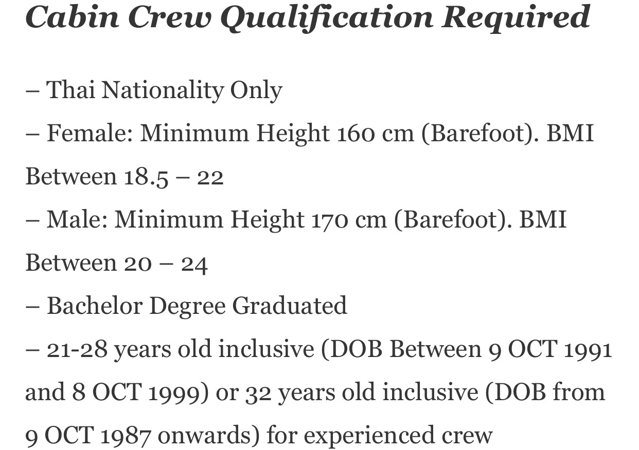 이들이 제시하는 공고에는 일반적인 아시아권 저비용 항공사의 채용과 같이 여자는 160cm, 남자는 170cm이라는 키 조건을 제시하고 있습니다. 항공사에 따라 그리고 측정하는 사람에 따라 조금 다를 수 있으나 칼같이 기준선을 지키는 일부 중동 항공사 오픈데이와는 달리 일부 외항사는 약간에 오차 범위는 허용하는 경우가 있긴 합니다. 물론 항공사에서 제시한 기준이 해당 국가에서 크루 라이선스를 받기 위하는 과정에 필수적인 기준이라면 칼 같이 제한할 수밖에 없다는 점은 기억해야 합니다.