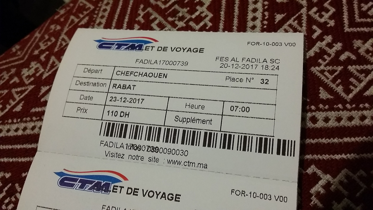 쉐프샤오엔으로 갈 때나, 라바트로 가는 버스가 하루에 2대 혹은 1대여서 미리 마라케시에서 예약을 하려다가 전화기가 꺼져 구글맵을 못 찾아서 CTM 터미널 못 가고, 페스에서 샀다. 숙소 주인에게 물으니 CTM 터미널까지 안 가도 숙소 옆에 CTM표 파는 오피스가 있다고 해서 2분 걸어가서 거기서 두 도시 가는 걸 미리 샀다. 짐표는 터미널 가서 사라고 해서 표만.