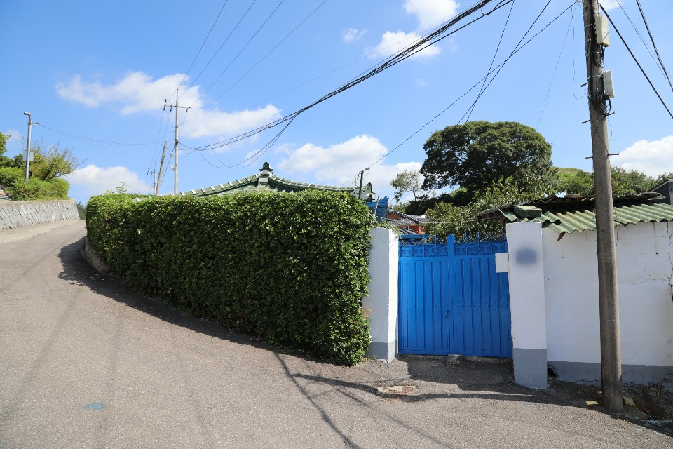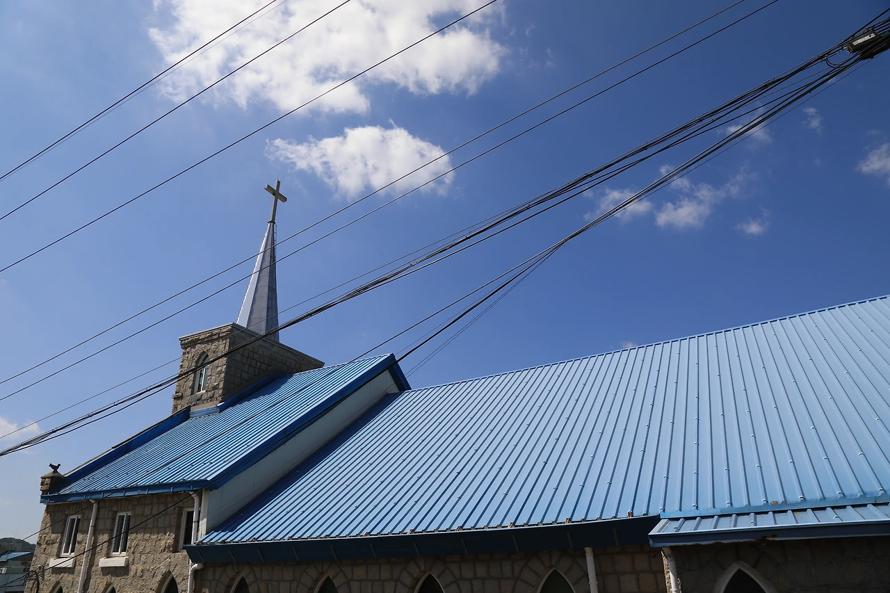 <흥양현 읍성>이라는 표지판을 보고 골목으로 접어든다. 목적은 당연히 '읍성이나 볼까?'다. 오르막길에 있는 교회 앞 도로에 차를 댄다. 교회 건물의 선이 시원시원하다고 느낀다. 선들은 꼬인 구석 하나 만들지 않고 뻗어있다. 거기에, 하늘의 색과 지붕의 색이 같다는 것도 한 몫한다.