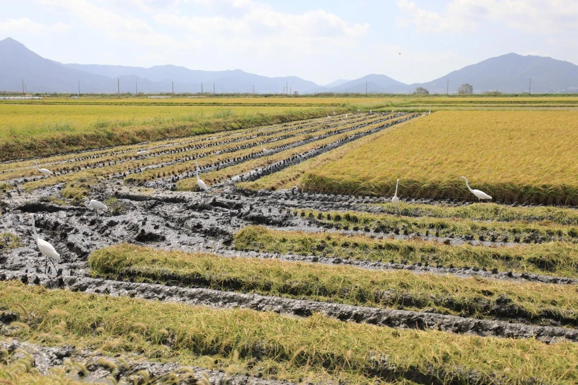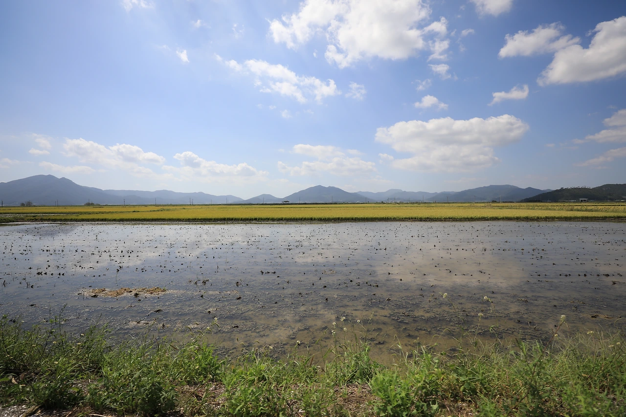 한쪽으로는 바다가 있고 한쪽으로는 산이 솟은 곳에 꽤 넓은 평야가 이어진다. 논을 가르는 직선 도로는 언제고 다시 오고 싶을 만큼 매력적이다. 추수를 마친 곳에 나락을 집어먹기 위해 백로가 여러 마리씩 모인다. 농부의 트랙터는 이런 손님은 관심 없다는 듯 심드렁하게 직선을 그으며 나아간다. 논에 비친 구름은 하늘의 구름과 같은 속도로 흘러가다 사라진다. 내 카메라는 빨랑빨랑 돌아가지 못한다.