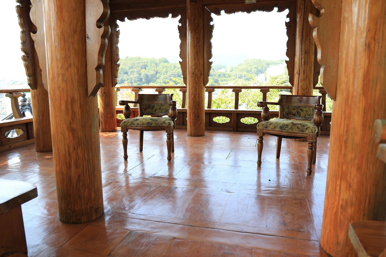 누각에 누군가 앤티크 의자를 한 쌍 놓았다. 쉽게 생각하지 못할 조합인데 묘하게 잘 어울린다. 내가 전문 사진가라면 어떤 의상을 입은 모델을 저 의자 위에 앉혀야 할지 한참 고민할 듯은 하다. 신원 미상의 옷을 입은 모델들도 어떤 표정을 지어야 할지 몰라 당황하긴 매한가지일 것이다.