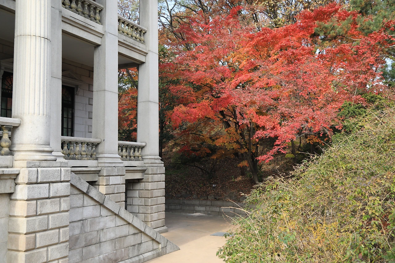 광해군이 즉위식을 했다는 조그만 건물을 지나 단풍이 한창인 뒤편으로 간다. 미술관 건물 옆의 한그루를 먼저 지난다. 축대 위에서 아치를 그리고 있는 나무다.