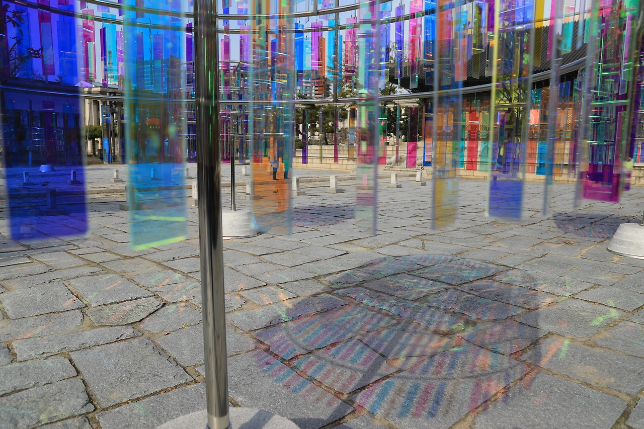 설치된 조형물 사이를 천천히 돌아다닌다. 빛을 잡아내기 위한 것인지, 빛을 드러내기 위한 것인지 모르겠지만, 조형물로 인해 가을빛에 조형이 더해진다. 별 말없이 조용히 땅으로 스며들려던 빛이 투명한 색들로 쪼개져 정체를 드러낸다.