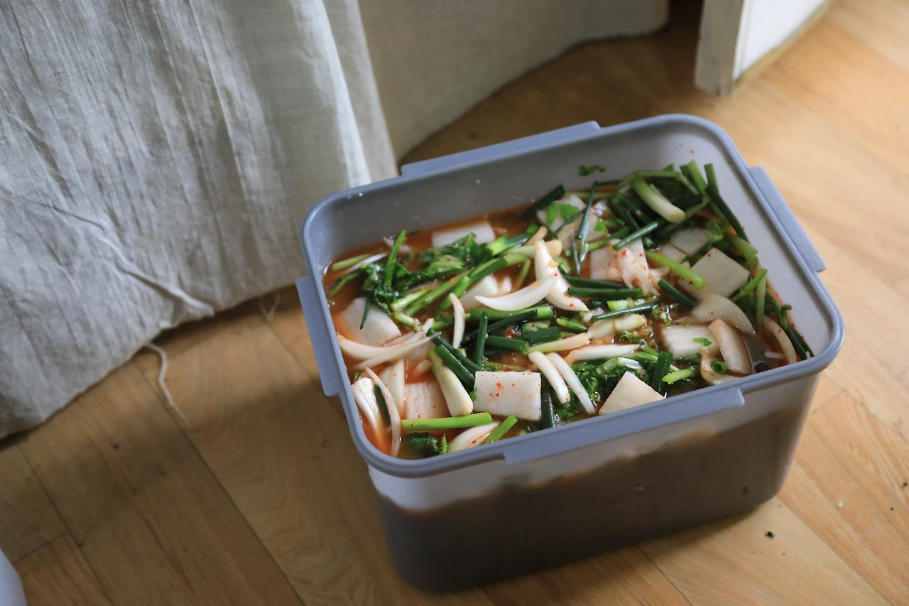 남은 골파와 양파는 저녁에 파전을 해서 먹기로 하고 둘이 뒷정리를 했다. 마트에서 사 온 고추가 눈에 띄어서 고추 넣어야 하나,라고 묻자, 아 참, 이란 대답이 돌아온다. 고추를 길게 어슷 썰어서 통에 넣었다. 빨간색이 강렬했다. 국자로 뒤적이자, 고추는 금세 열무 사이로 자취를 감췄다.