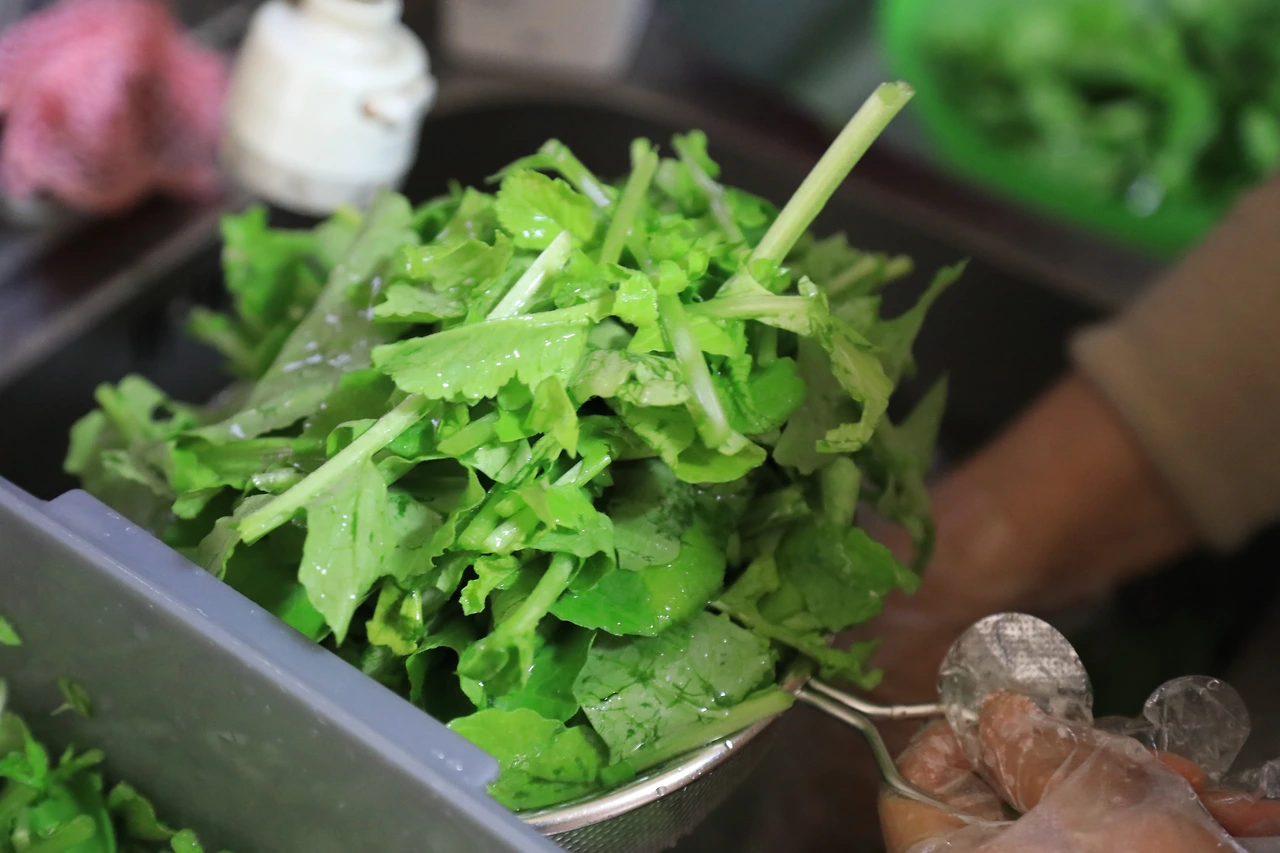 녹색의 열무잎이 찬 물에 씻겼다.