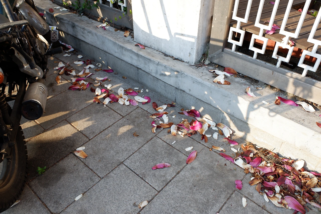 일부러 땅에 떨어진 꽃잎들을 먼저 보고 나서, 나무를 올려다본다.