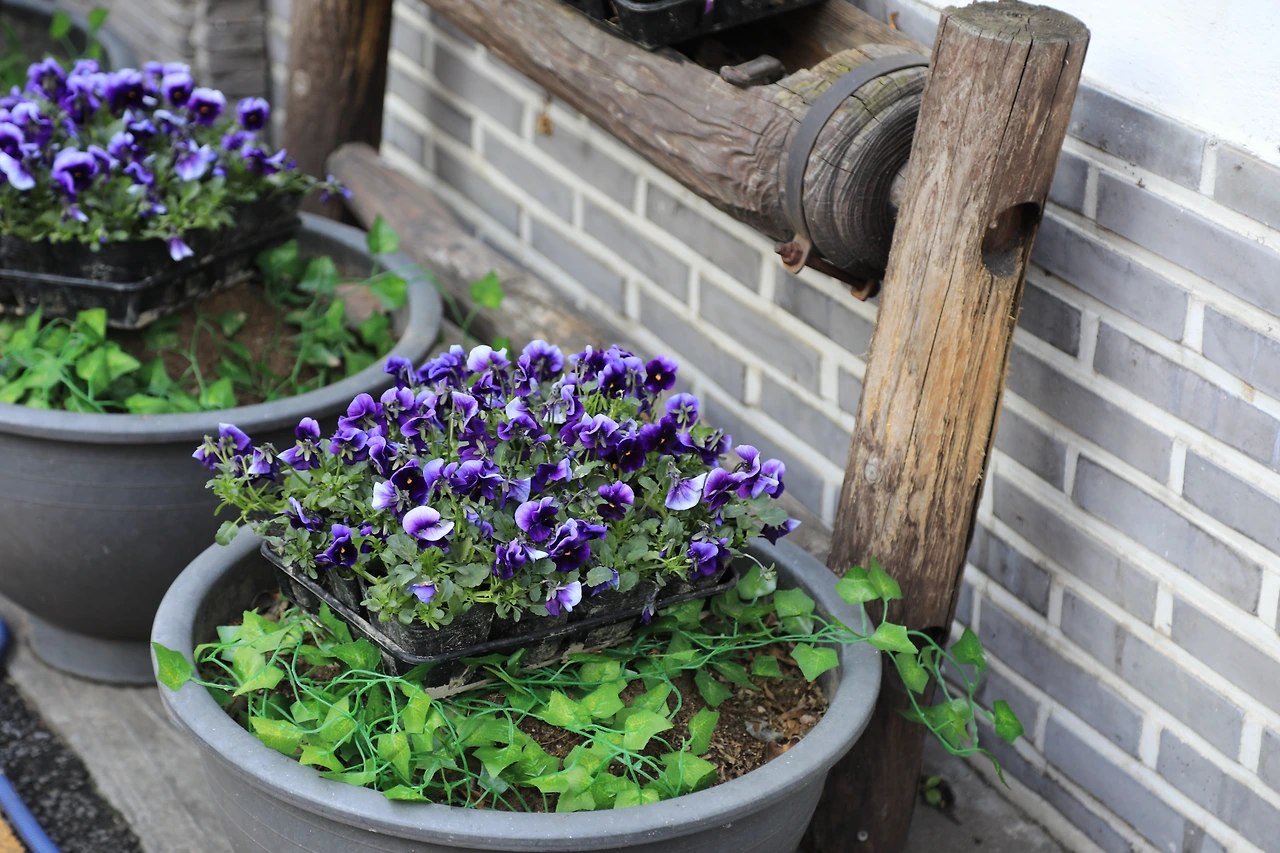 주차장 벽 위에는 개나리가, 찻집의 벽 아래엔 팬지가 만개했다.