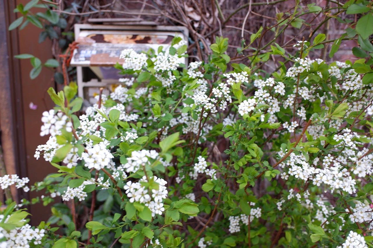 담쟁이넝쿨 앞으로 나무가 꽃을 잔뜩 피웠다.