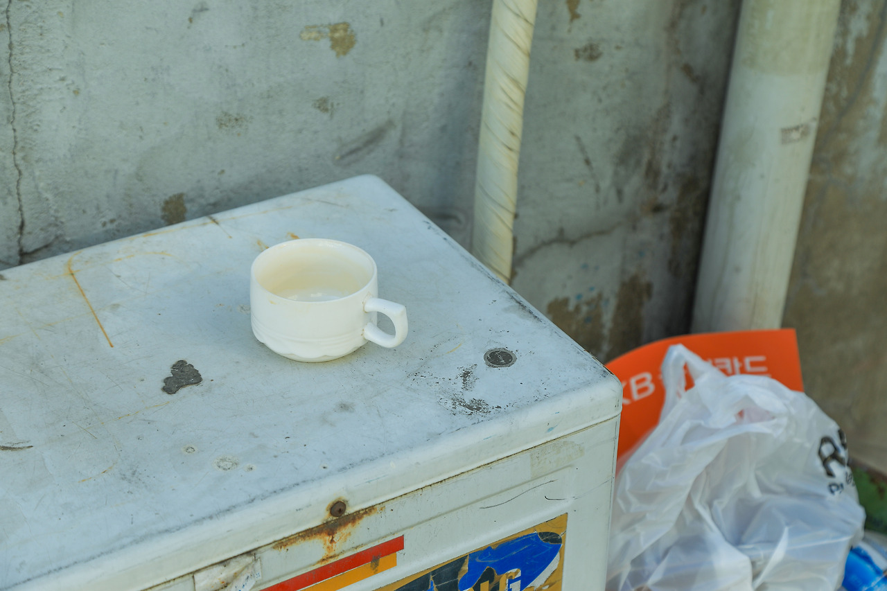 아침 출근길, 에어컨 실외기 위 빈 커피잔이 눈에 들어온다.