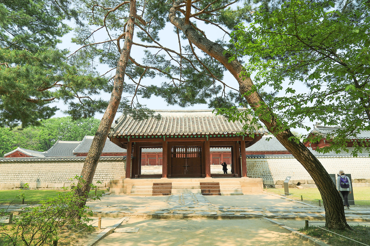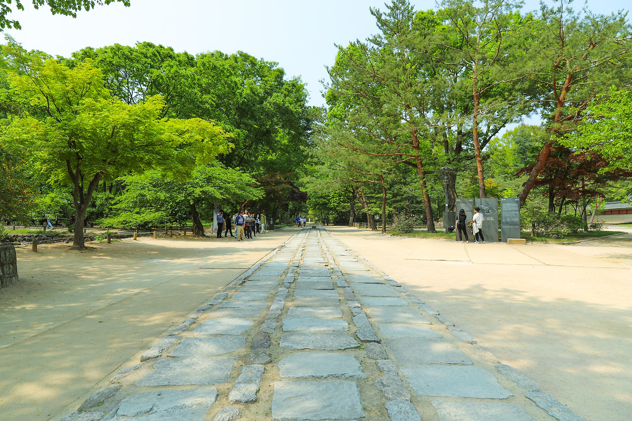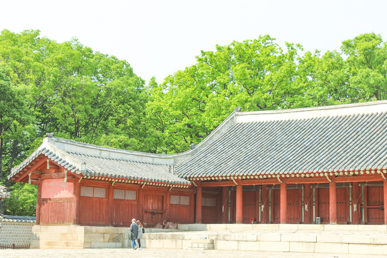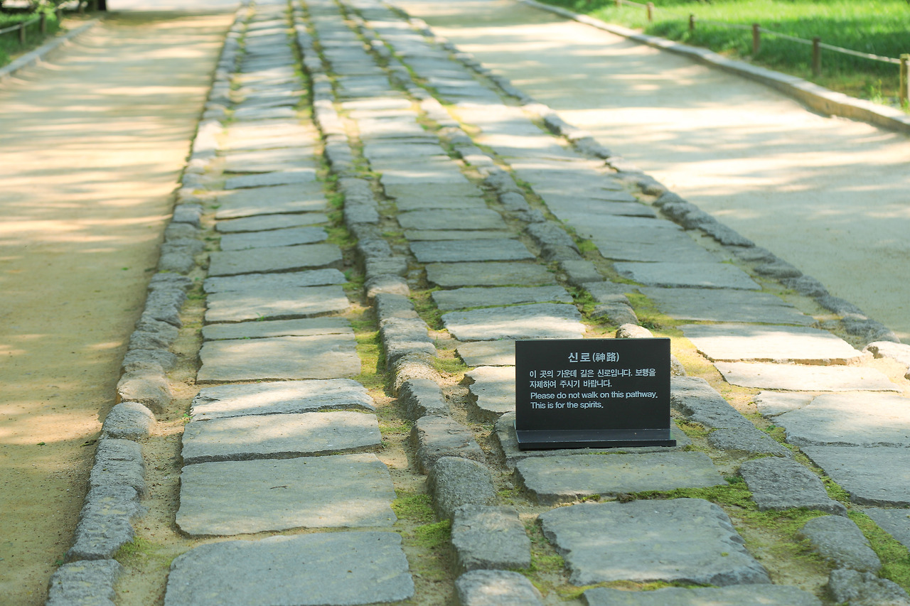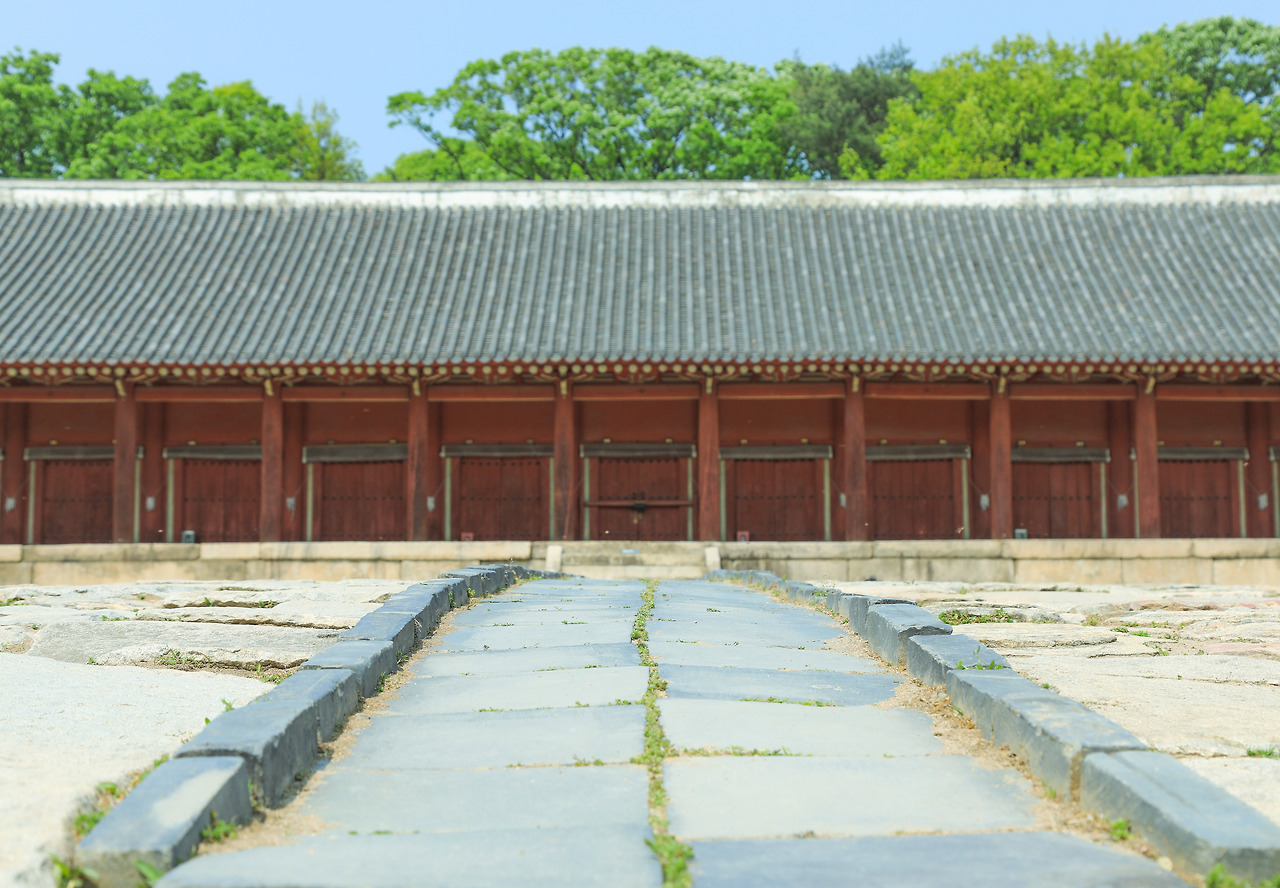 정전은 선왕과 왕비의 신주를 순위에 따라 모셨다는 곳이다. 건물은 열린 구조다. 정면의 건물 한 칸마다 신주가 있다고 한다. 신로는 중앙으로 향한다. 사진을 찍고 보니, 중앙으로 향한 그 선이 가차 없는 직선이 아니다. 돌의 모양에 따라 선은 미묘하게 중간중간 틀어져있고, 그 끝은 사당의 계단의 정확한 중간은 아니다. 옛날 사람들이 돌의 가공을 못해서 같지는 않지만 다른 이유는 찾지 못한다. 다만, 뭔가 각도와 거리, 너비 등이 완벽하게 틀에 맞춰 있을 법한 공간에 이런 투박함이 보란 듯이 있는 것이 즐겁다.