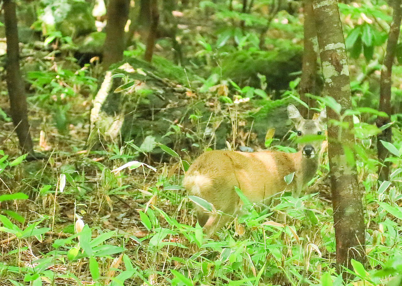 나무가 부러지거나 새가 날아오르는 가벼운 소리가 아니라, 묵직한 뭔가가 움직이는 소리가 들려 쳐다보니 옆의 수풀에서 노루가 날 쳐다보고 있었다. 멈춰 서서 혹시 저 노루가 내 쪽으로 오지는 않는지 노려봤다. 다행히 노루는 나만큼이나 겁이 많았는지, 잠시 후 숲 깊숙이 달아났다. 한라산 노루랑 좀 더 낭만적으로 만났으면 좋았을 텐데...... 두 번째, 세 번째 노루랑 만났을 때도 난 호들갑스럽게 놀라고 조용히 노루가 물러나길 기다릴 뿐이었다. 조급함을 훤히 내보이면서.