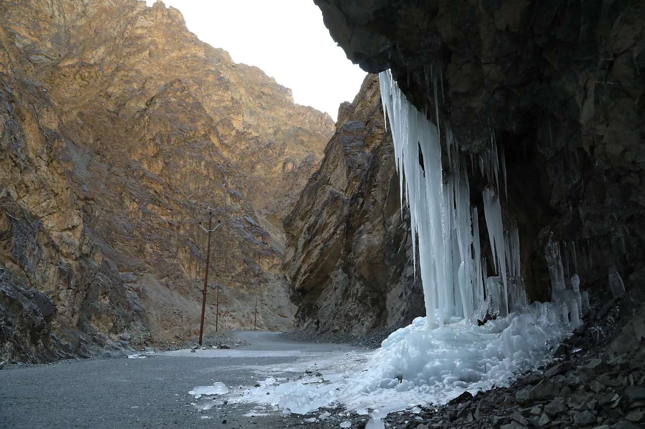 계곡 물은 길 아래에 있는데, 얼어붙은 물은 어디에서 내려온 건지 알 수 없었다.