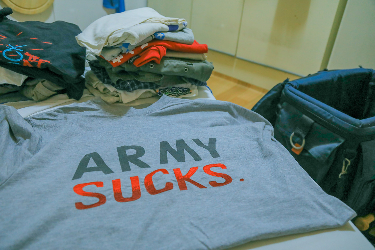 굳이 네팔의 옷가게에서 'SUCKS'라고 기계수를 놓았던 군대 운동복을 보니,