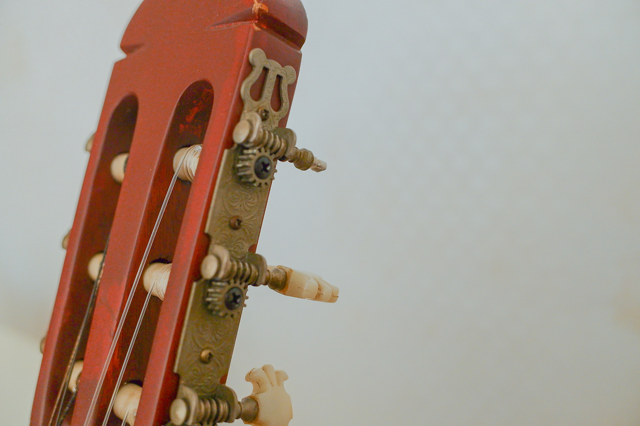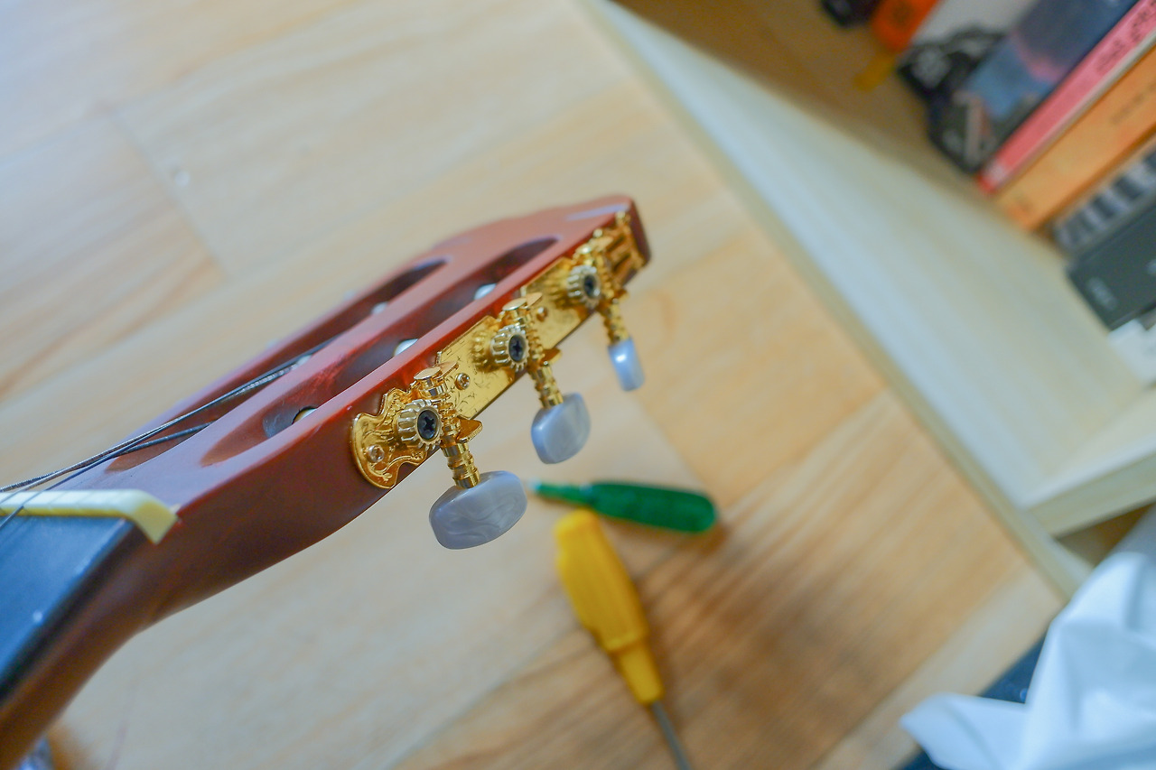 반쪽의 부품이 제거된 기타의 헤드는 간결해 보인다.