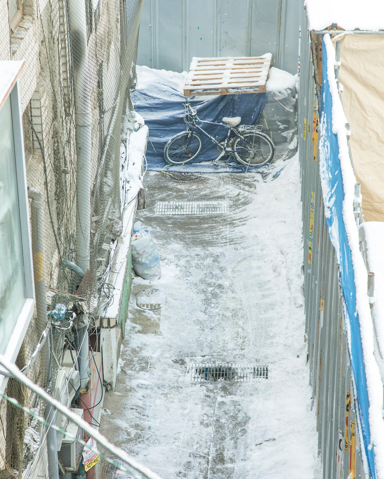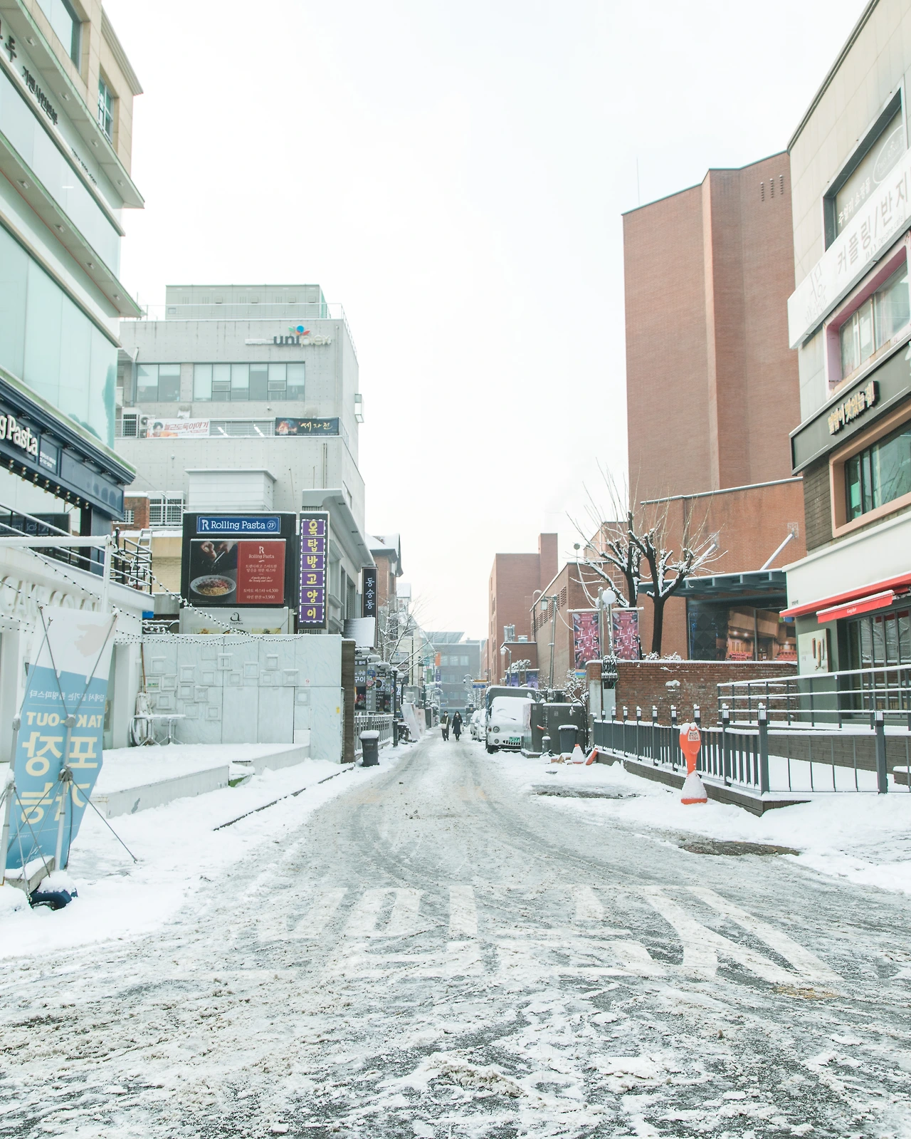 위의 눈들은 사람들의 발자국, 자동차의 타이어 자국 등으로 어지럽지만,
