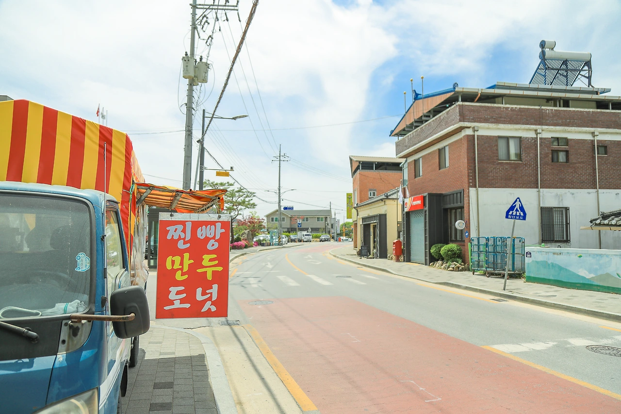그늘을 골라 잠시 걷다 보니, 길 건너 농협 앞에 찐빵과 만두를 파는 트럭이 보였다.