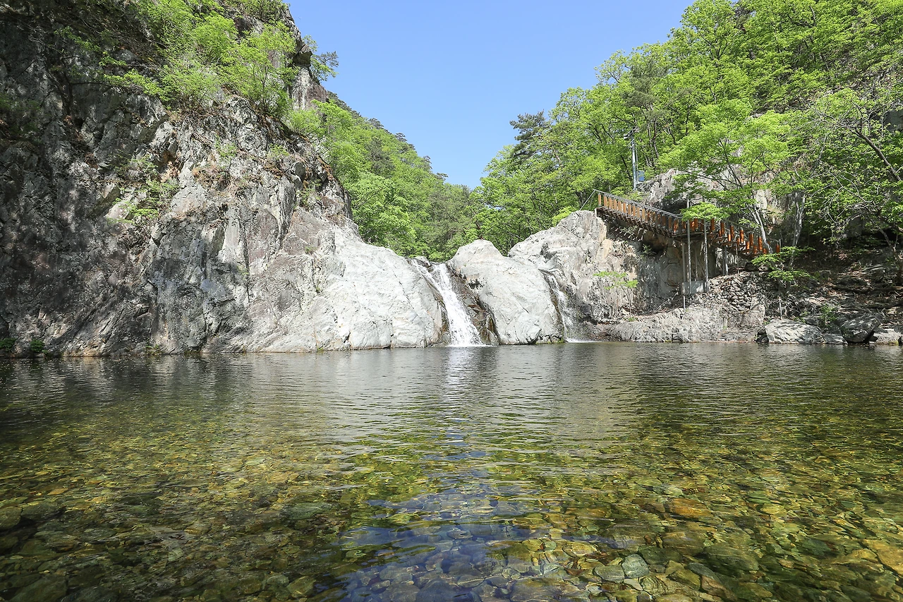 짧은 구름다리를 건너자 높은 암석 벽에 둘러싸인 폭포가 나타났다.