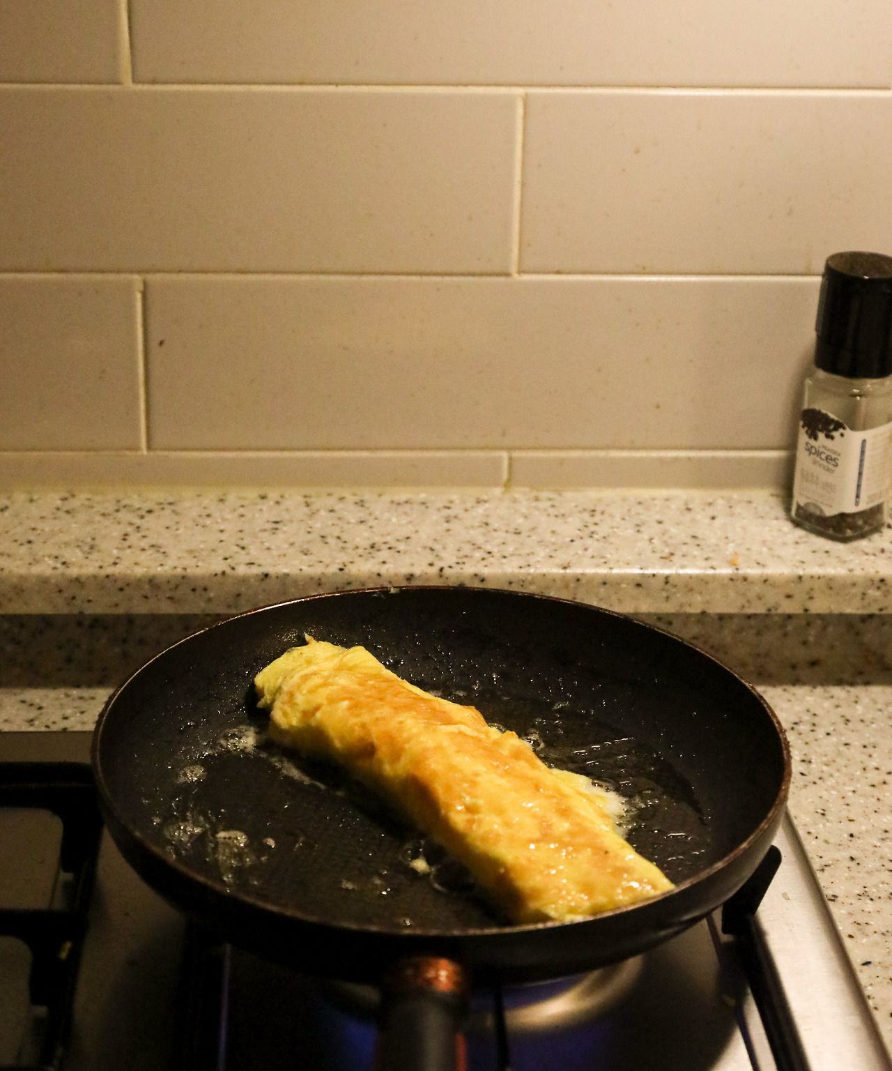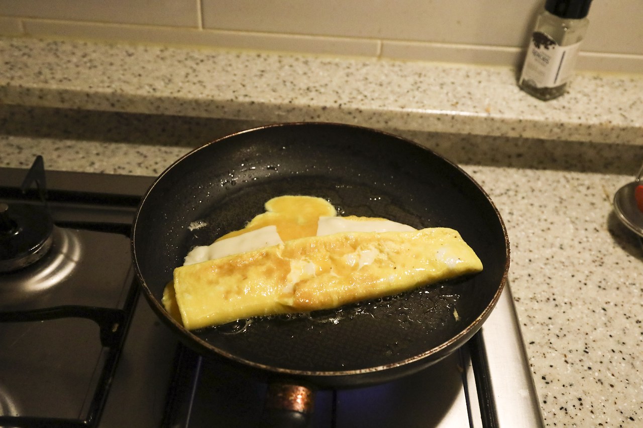 레시피대로, 마지막에 접힐 부분이 너무 빨리 익지 않게 불에 닿는 팬의 위치를 조정한다.