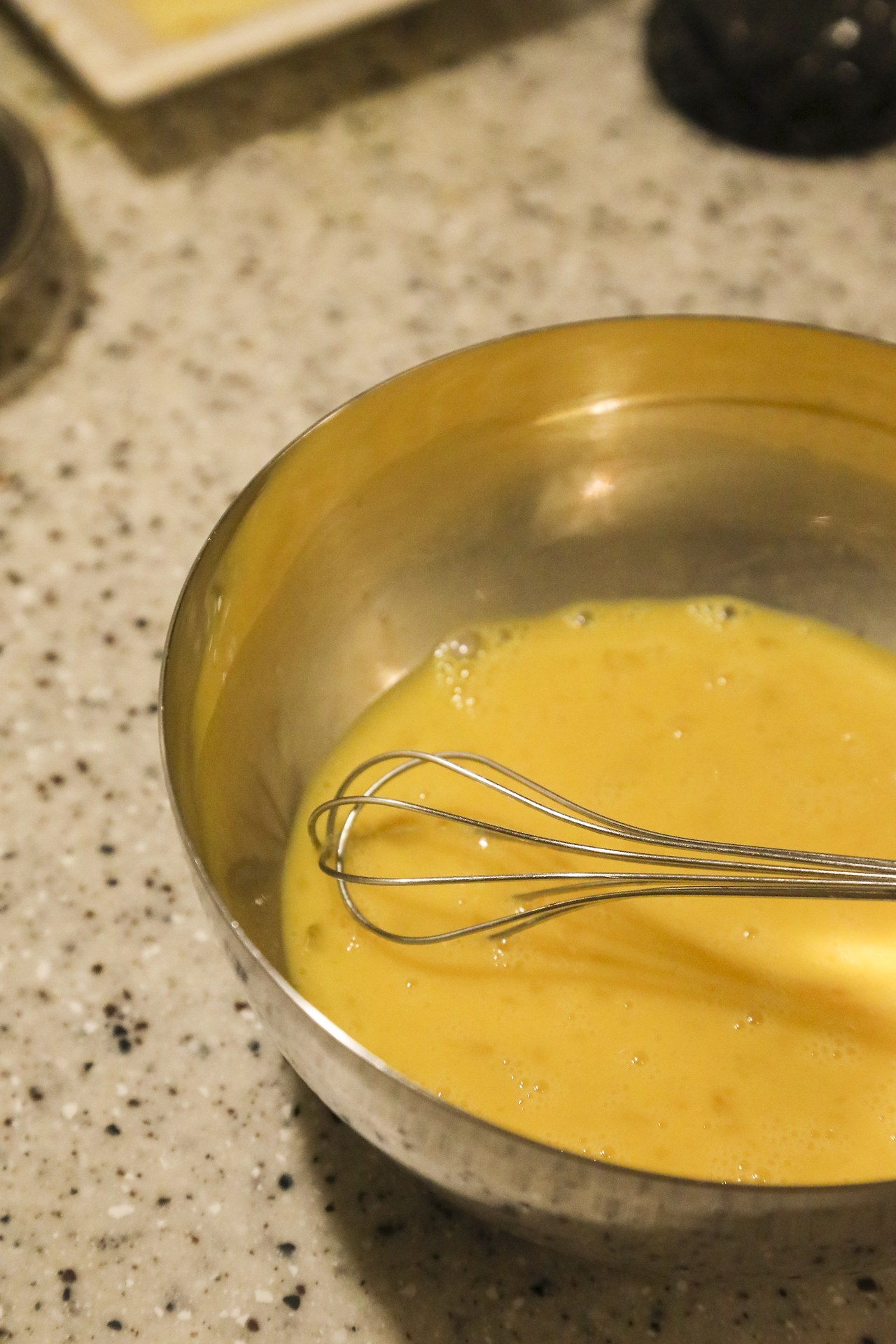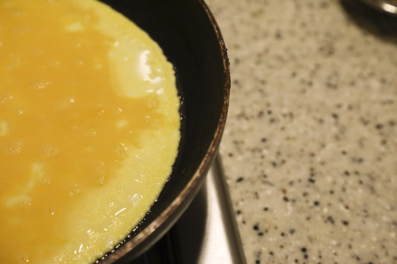 그리고는 중불로 가열한 팬에 식용유를 두르고, 계란물을 붓는다.
