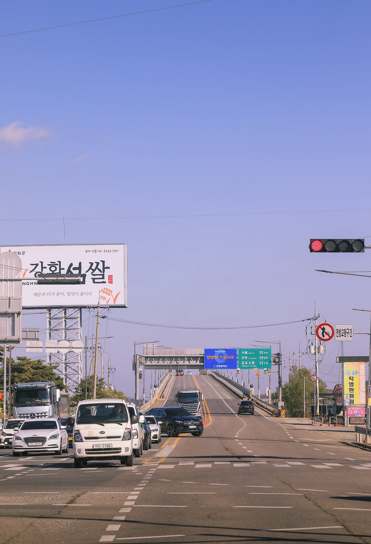 강화와 인천을 잇는 다리로 들어가는 교차로,