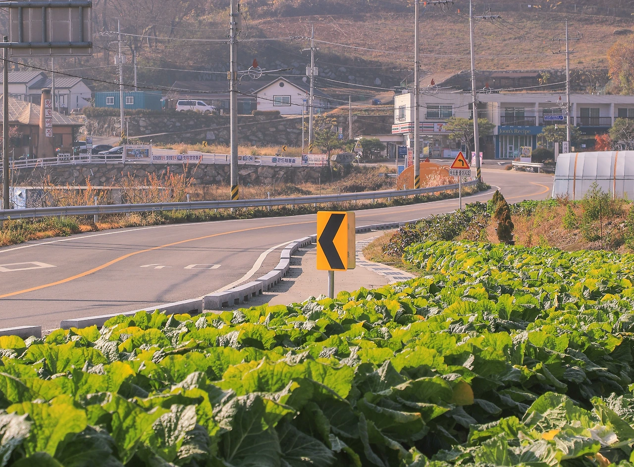 모두 둘러보고 나서 정작 한참을 감상한 건 배추밭이었다. 적당히 차가운 공기와 배추의 초록이 어울렸다. 휘어진 도로를 따라 심은 배추밭의 굴곡이 단정했다.