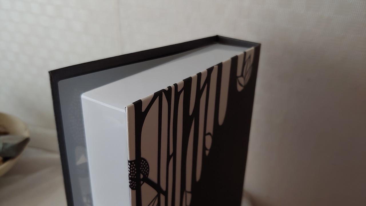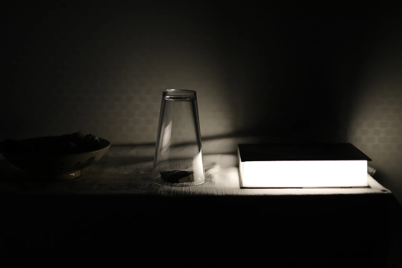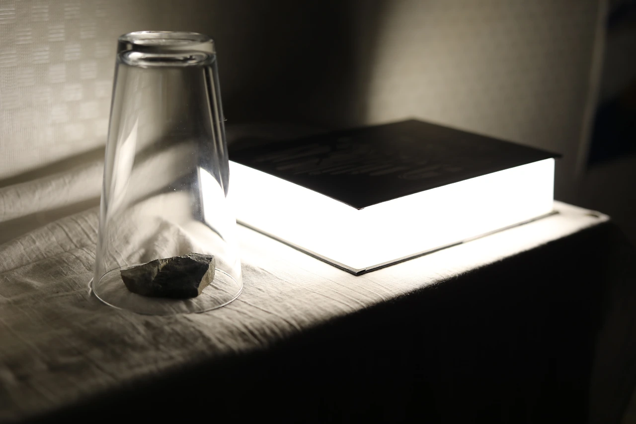 얼마 뒤 다시 자리를 잡은 곳은 부엌에 있는 작은 책장 위였고 그때부터 지금까지 계속 그 자리에 있다. 책 모양이라고 해서 늘 세워두어야 한다는 고정관념이 있었는데, 어쩌다가 뉘었더니 그 나름의 안정감이 있었다. 조명을 켜고 보다가, 뭔가 허허로워서 유리잔 하나를 옆에 두고 그 안에, 여행 다닐 때 주워왔던 돌 하나를 넣어두었다. (새로운 걸 추구하기보다, 가지고 있는 물건으로 이리저리 고민하는 건 내 안의 잉여적 기질이 아닌가 싶기도...)
