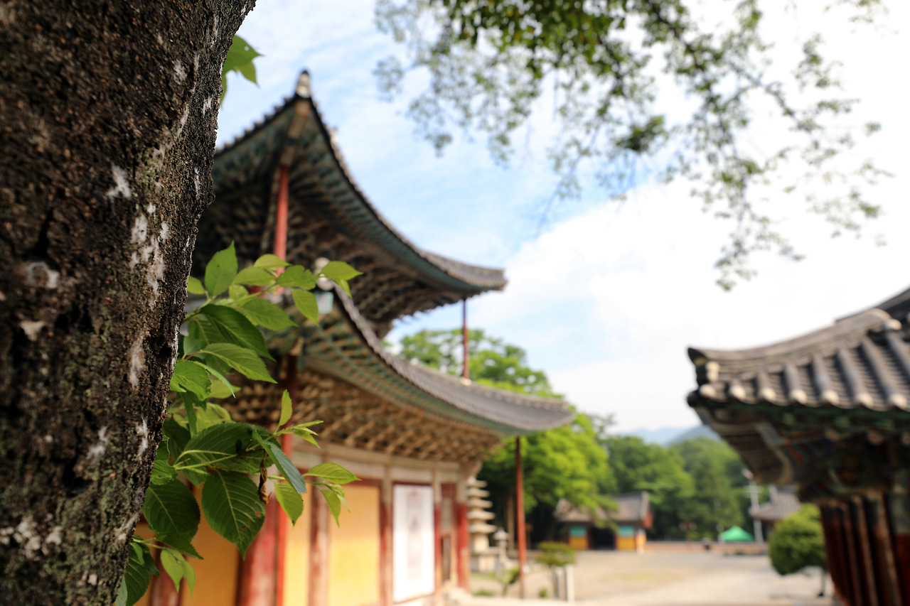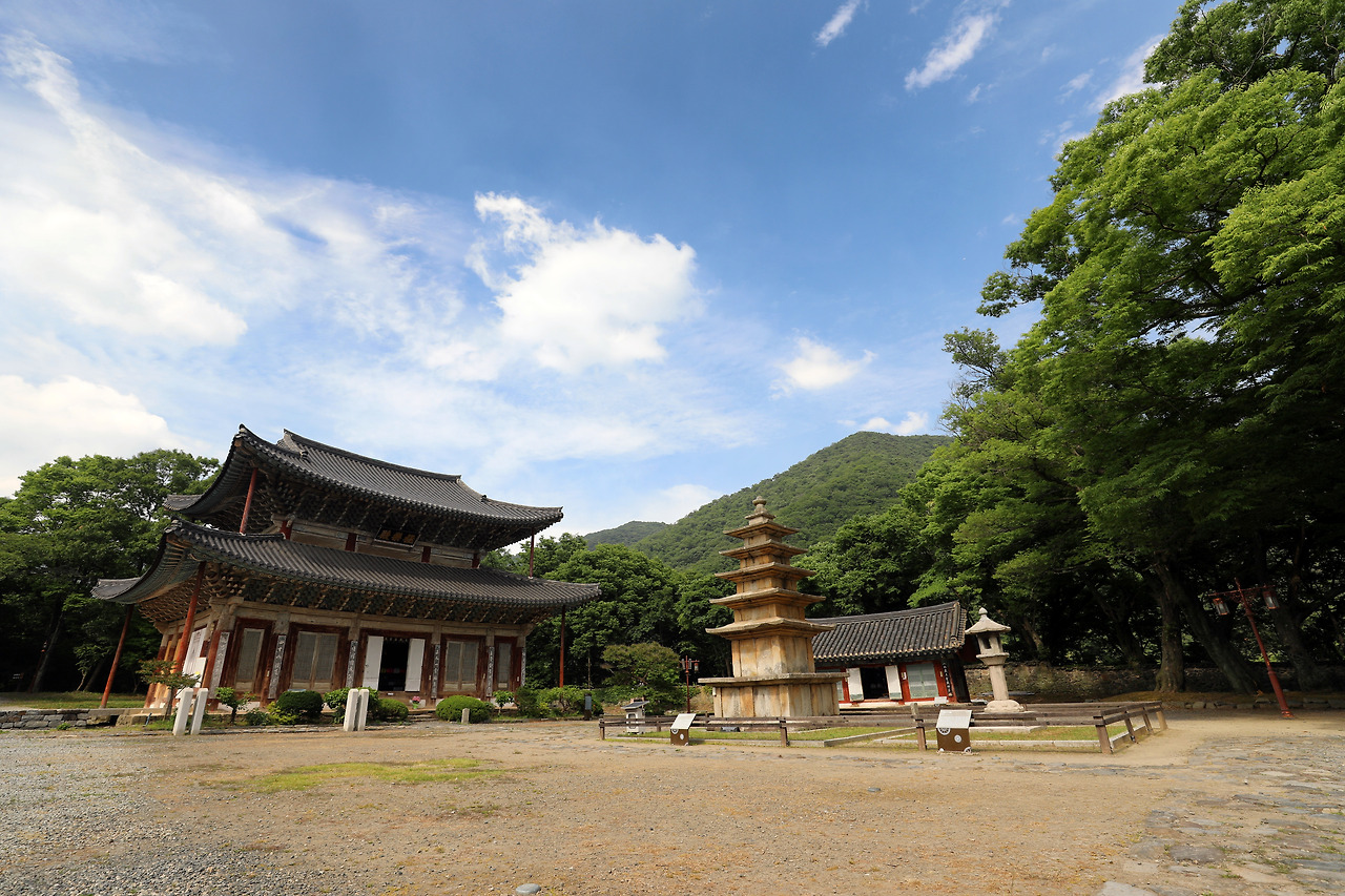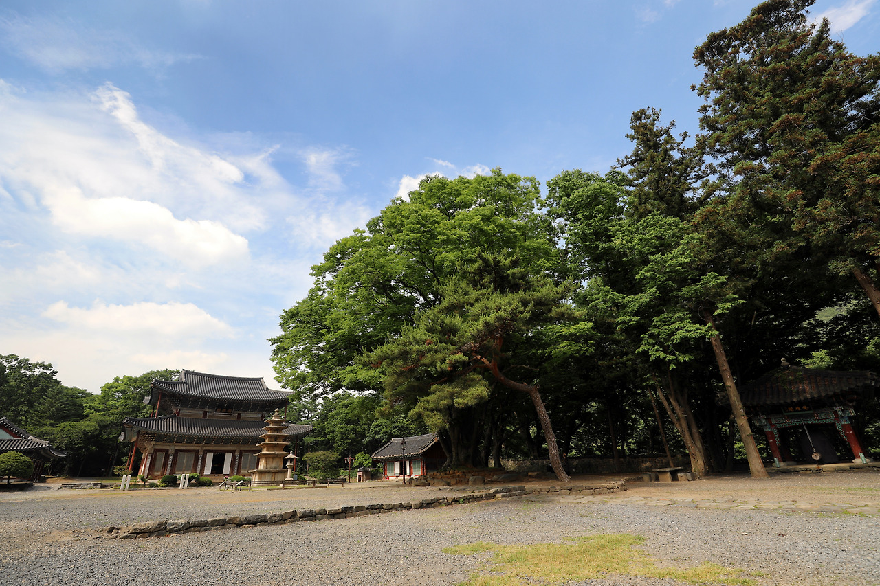 오른쪽에 서 있는 고목 몇 그루는 그 울창함에도 불구하고 위세를 내보이지 않는다. 평생 심통 한 번 부리지 않고 웃기만 한 사람 같다. 나무 뒤에 석등과 5층 석탑이 서 있고, 그 뒤로 대웅전이 있다. 모두 나무를 닮아 겸손해 보인다. 뒤로 보이는 산도 마찬가지다.