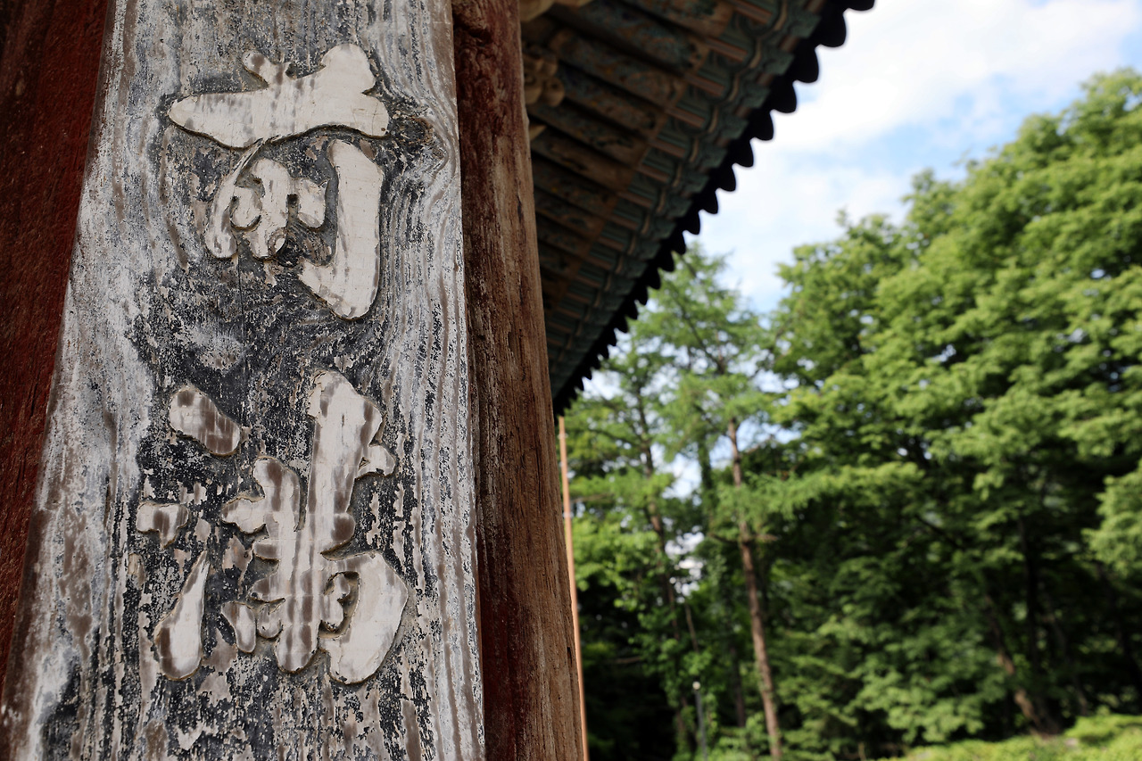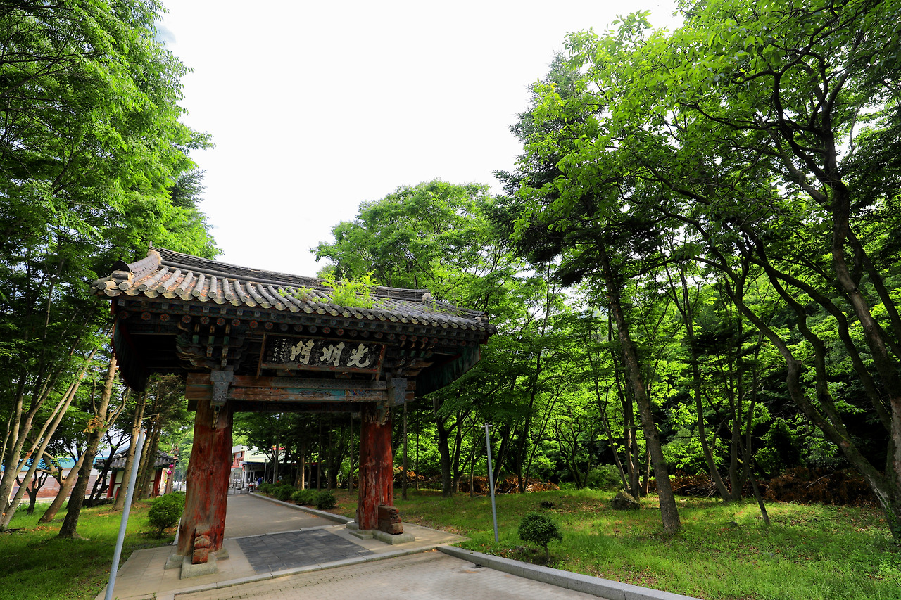 길 주위로 크게 자란 나무들 덕분이다. 관광객이 적어서 눈에 보이는 색깔이 몇 개 되지 않는다. 땅색, 나무색, 이파리 색 그리고 하늘색. 광명문이라는 현판이 붙은 산문(山門)의 기와 위로 풀 몇 포기가 자라 섬을 이뤘다. 산문은 그런 것 따위 신경 쓰지 않는 듯하다. 산문에는 화려한 덧칠 같은 게 없다.