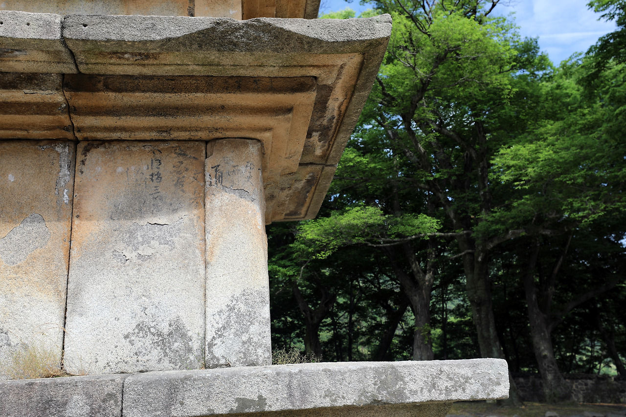 정밀조사가 진행 중이라는 조그만 표지판이 하단부 앞에 세워져 있다. 탑에 대한 설명을 보니, 탑 안에서 귀중한 것들이 많이 발굴됐었다고 한다. 낮은 탑 안에 열망을 봉인해놓은 이들은 어떤 생을 살다가 어떤 죽음을 맞이했을까. 안정감 있게 쌓아 올린 5층의 돌들은 애초부터 하나였던 것처럼 무리가 없다. 앞으로도 꽤 오래 돌과 돌이 마찰되는 소리 같은 건 탑에서 나오지 않을 것이다.
