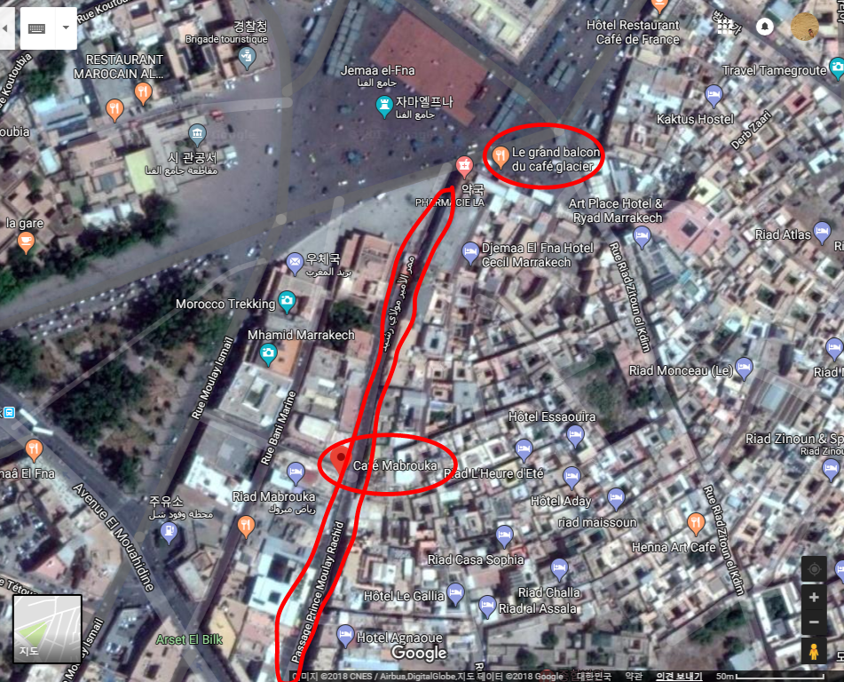 *참고로 위쪽에 동그라미 표시한 곳은 저녁과 밤에 제마엘프나 광장 전망을 보기 좋은 카페다. 옥상 가면 아예 들어갈 때 돈을 내고 주문을 하고 입장을 해야 한다. 차 한 잔이 당연히 다른 식당보다 비싸지만 뷰는 보장한다. 첫날 어리버리 광장만 돌아다니고 둘째 날 여기서 전망을 봤다. 사진 찍은 사람들도 바글바글하다. (혹시나 해서 구글 좌표 남겨놓음)