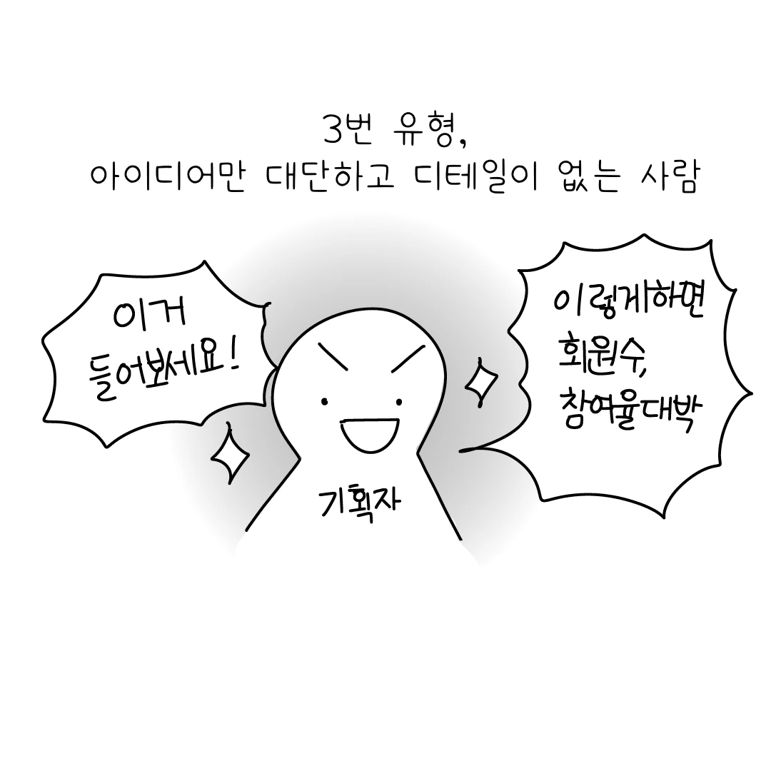 3번 유형 : 창의적인 것과 다름! 기획서 세세한건 나몰라라 하는 분들을 말합니다 ㅜㅜ그 고생은 고스란히