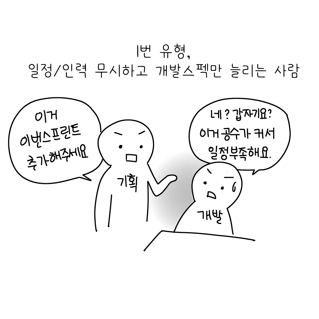 1번 유형 : 특히 개발기간 후반부에 요구하는 상황으로 작은 버그수정요청과는 다른 결입니다!