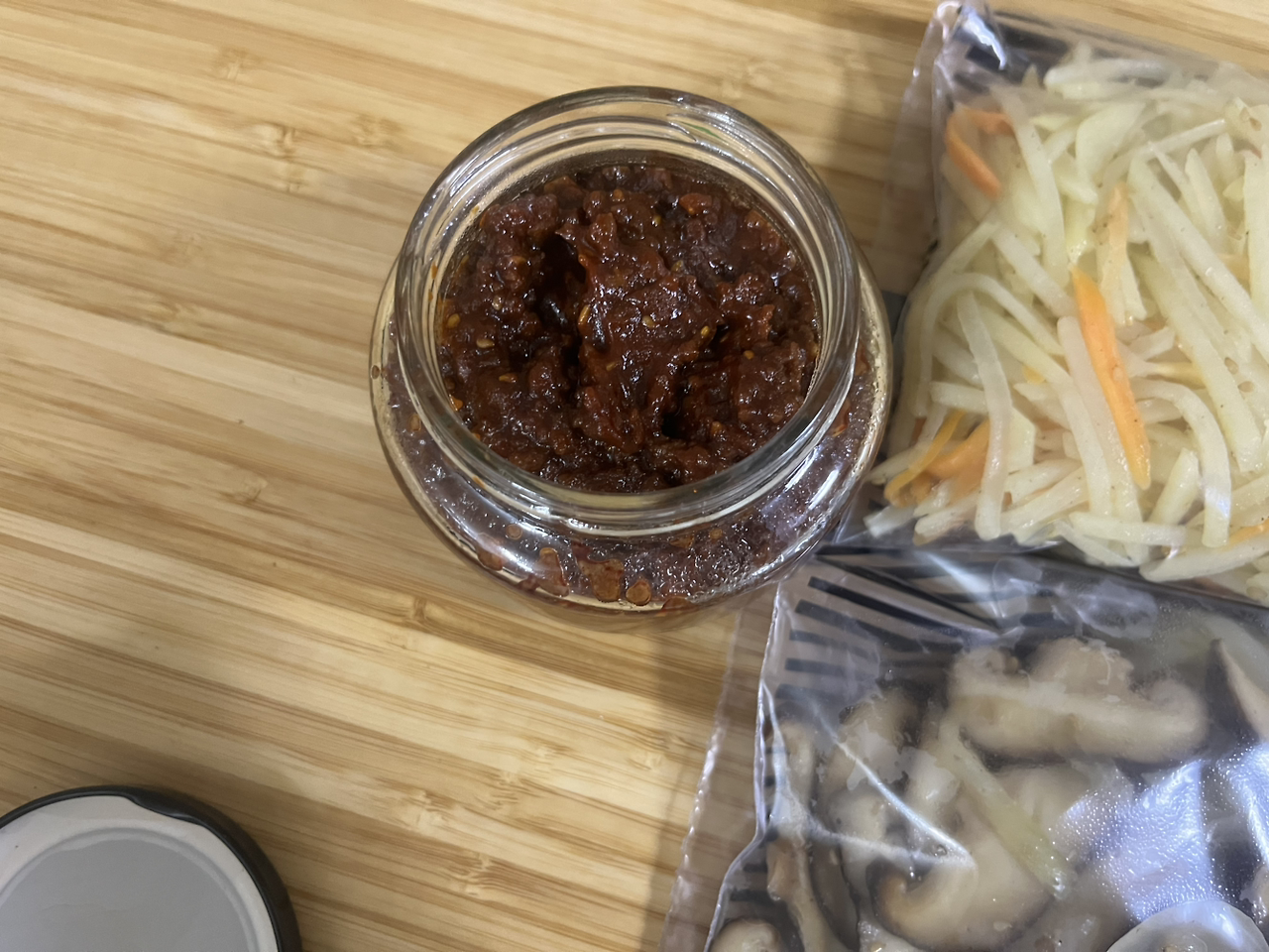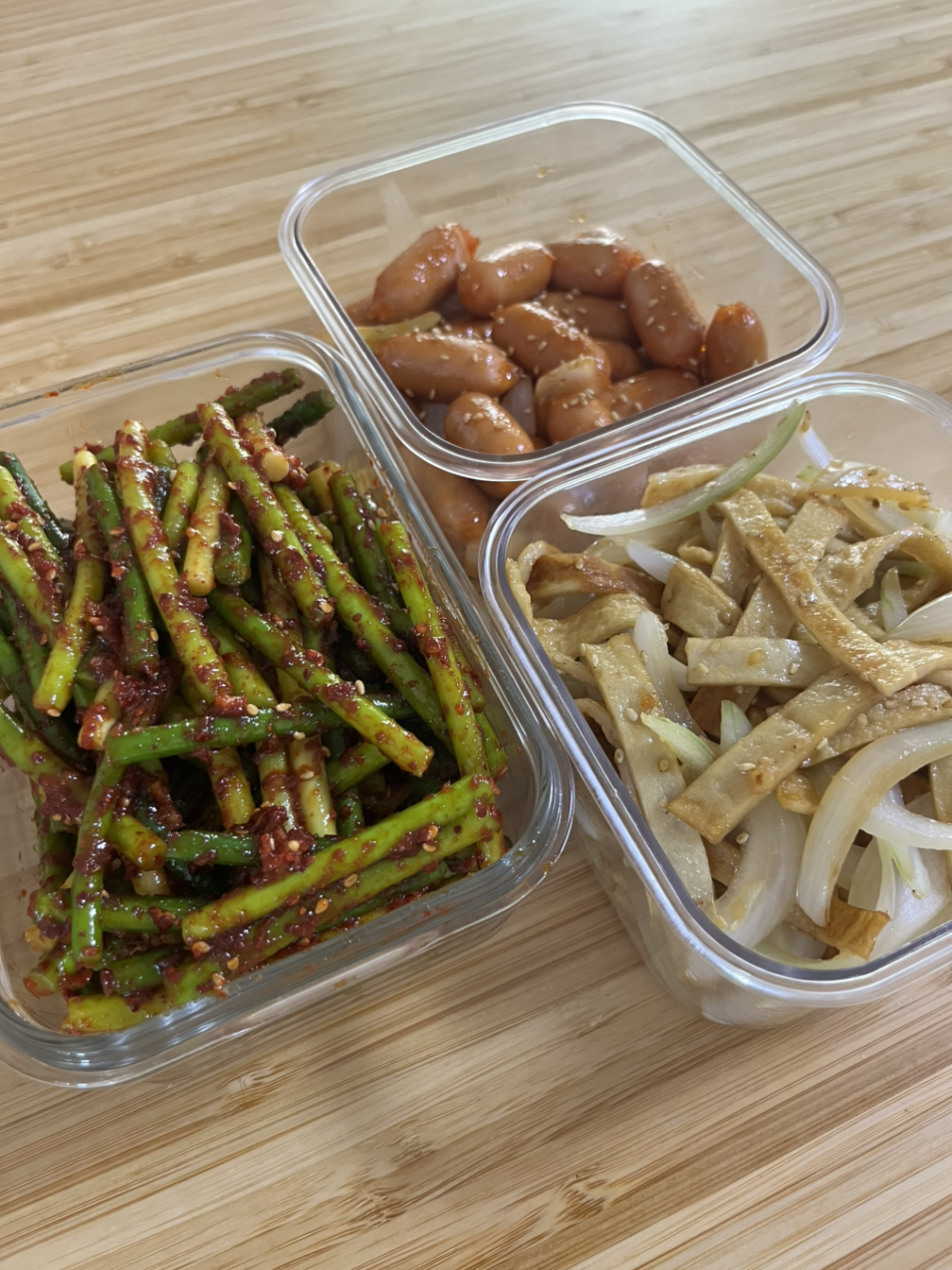 깐 메추리알을 한 봉 사와 10분 컷 메추리알 장조림을 하고, 집에 있던 감자, 당근으로 감자채, 표고버섯과 채 썬 양파를 볶은 버섯볶음, 염장미역줄기 짠기 빼고 양파와 볶아 미역줄기볶음, 여기에 예전부터 엄마가 종종 해 주던 소고기고추장볶음을 했다.