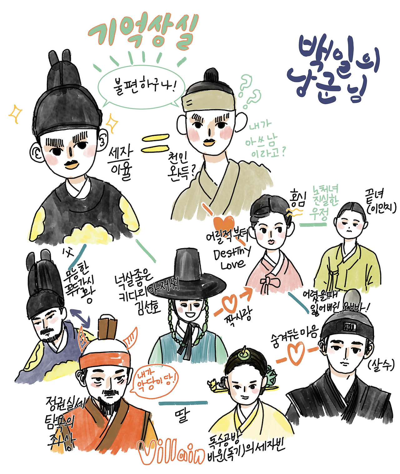 하지만 재밌다. <백일의 낭군님>은 뻔한 이야기 속에서도 로맨스 코미디로서 제 빛을 발한다. 여기에는 등장인물들의 개성과 호연이 가장 큰 역할을 한다. <백일의 낭군님>에 출연하는 모든 등장인물은 저만의 서사와 성격을 갖고 이야기를 움직인다. 도구로만 사용되지 않는다는 뜻이다. 조연에 불과한 박복은 아전도 "갱장하네~"라는 유행어를 갖고 있을 정도이다. 작가가 등장인물 모두를 사랑하고 있고, 이야기를 촘촘하게 준비했다는 것이 느껴진다. 실제로 <백일의 낭군님>의 노지설 작가는 이 작품을 2년 넘게 준비해왔다고 한다.