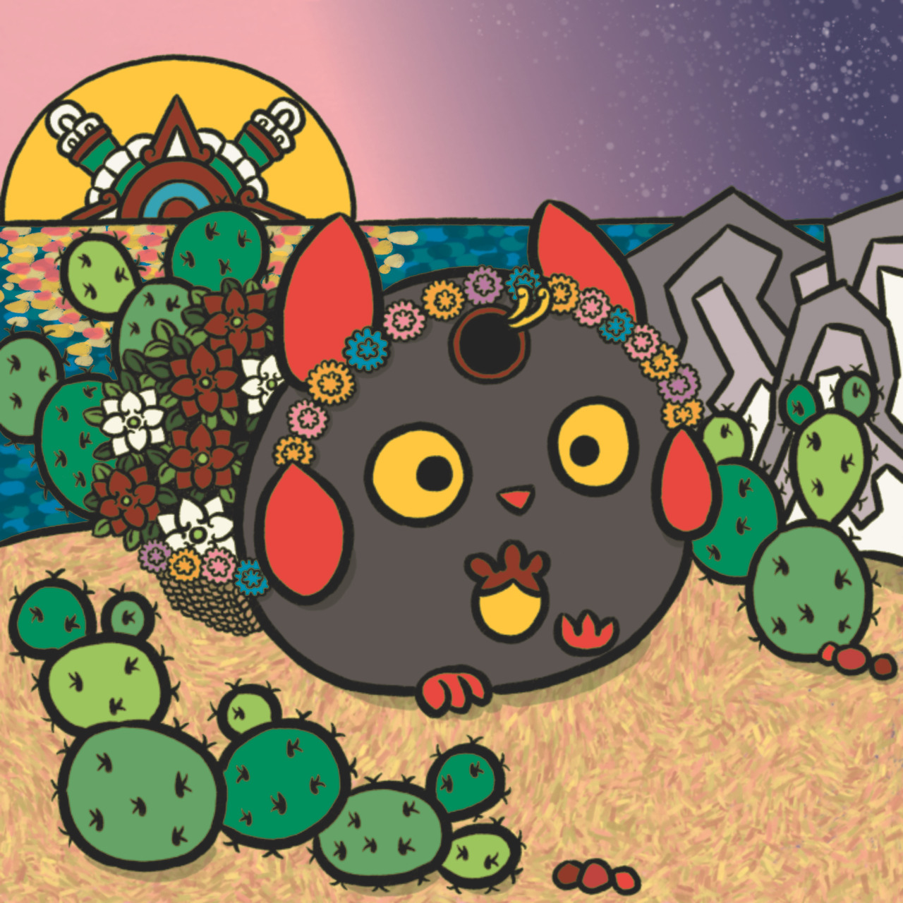이 카드에서 쫄리가 등에 짊어진 쿠에틀라쇼치틀 꽃 일곱 송이는 ‘7-꽃’이라는 별칭을 가진 성소수자들의 수호신 쇼치필리(Xochipilli)를 상징합니다. 밤이 물러가기 시작하고 동이 막 터 오는 하늘의 모습은 성소수자들을 향한 사회의 시선이 아직은 가혹해도 분명 밝아질 날이 온다는 사실을 나타냅니다.