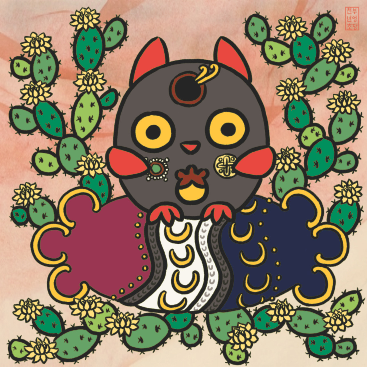 쫄리를 둘러싼 천년초 선인장(Opuntia humifusa)의 열아홉 꽃송이들도 재물의 불완전성을 의미합니다. 옛 아스테카의 상징 체계에서는 숫자 20이 완전수로 여겨졌기 때문에 그보다 하나 모자란 숫자 19는 재물이 삶의 수단일 뿐 결코 목적이 될 수 없음을 암시합니다.