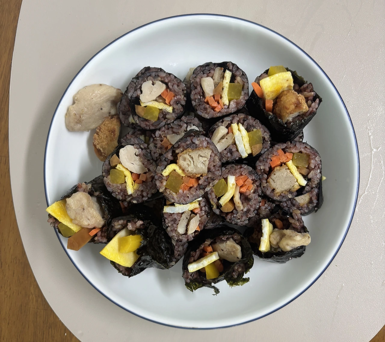 어느 토요일 저녁 남편과 함께 보던 예능 프로그램 방송에 김밥이 나왔다. ‘내일 김밥 해 먹어 볼까?’ 하는 얘기를 나누며 새벽배송으로 김밥용 김과 단무지와 우엉을 주문했다. (김밥에는 단무지와 우엉만 넣어도 본전을 찾는다고 생각한다) 단백질 재료는 냉동실에 남아있던 미니 돈가스와 냉동 닭가슴살을 활용하기로 했다.