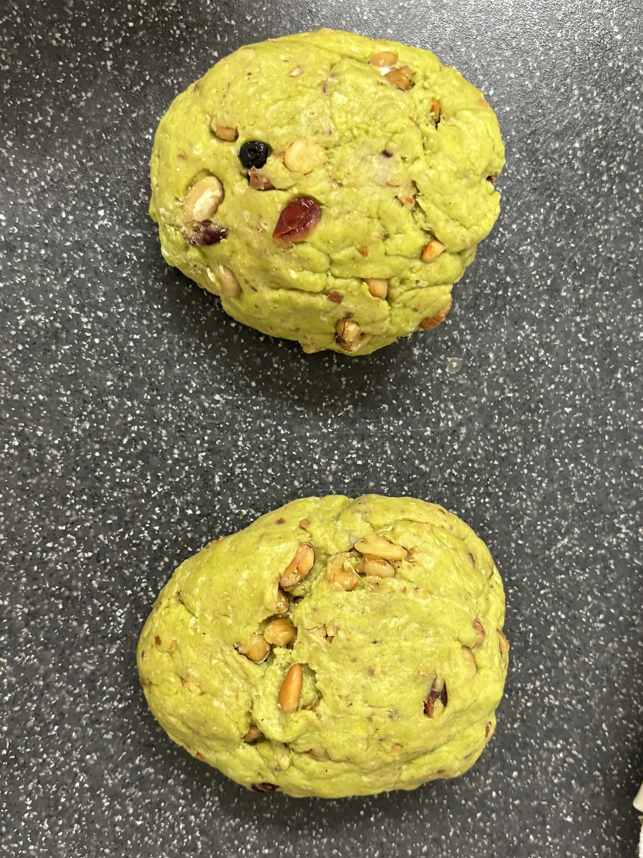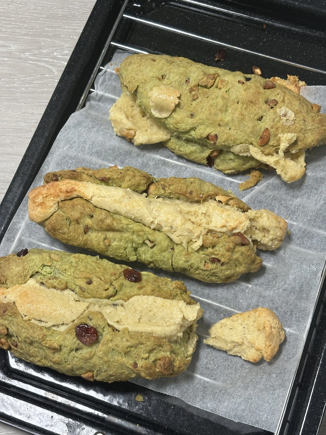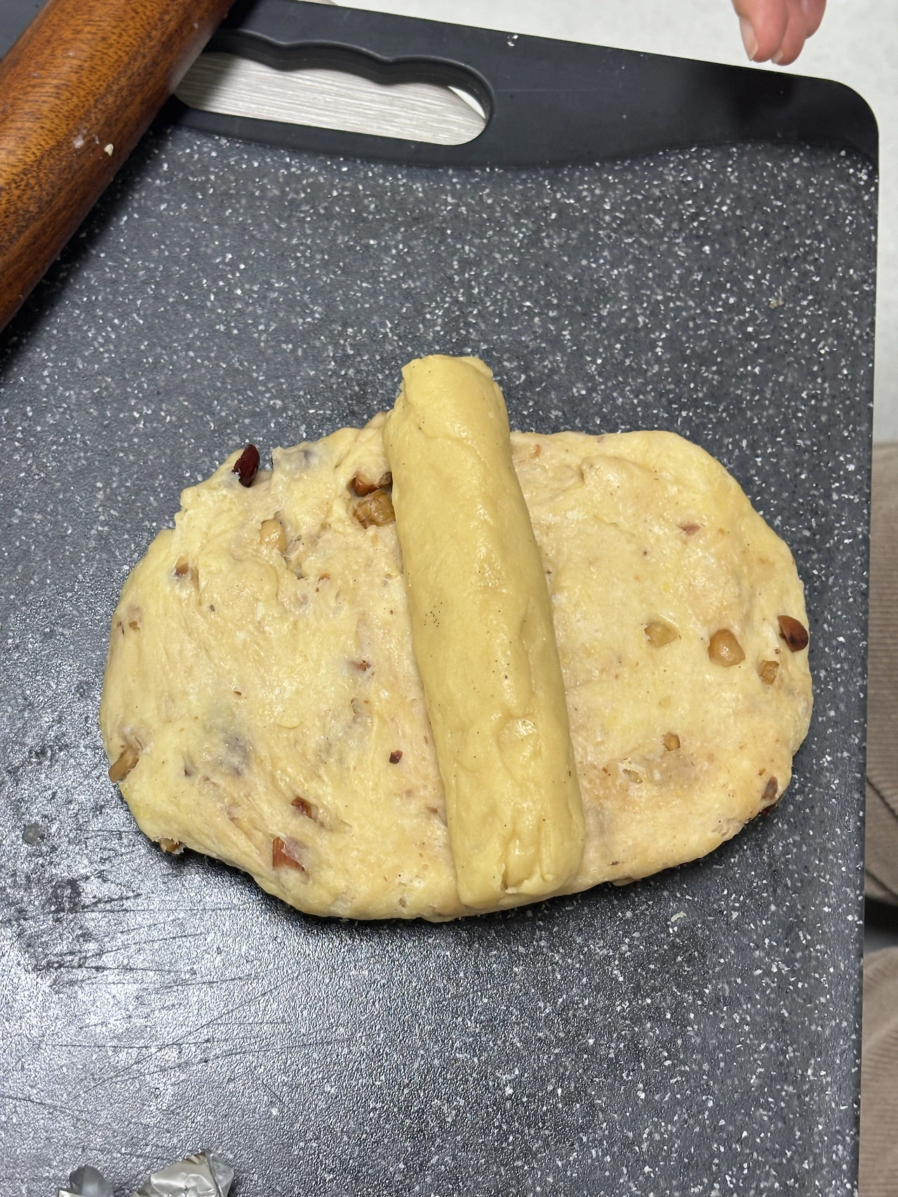 막상 결심을 하고 시작하니 슈톨렌 반죽은 무난하게 만들어졌다. 견과류와 건과일은 럼주에 미리 절여놓는데, 나는 럼주 대신에 제과제빵용으로 나오는 럼 향이 나는 시럽인 럼 레진을 사용했다. 럼주보다 훨씬 저렴하다. 밀가루를 계량하고, 버터를 넣고, 계란을 넣고 우유를 넣어서 반죽한다. 이때 럼에 절인 견과류와 건과일을 넣고 나면 반죽이 질어지기 때문에 반죽을 상당히 뻑뻑하게 해야 한다. 취향에 따라 반죽에 말차 가루를 넣을 수도 있고, 너트맥 같은 향신료를 조금씩 추가해도 된다. 만든 반죽을 발효시키는 동안 ‘마지팬’을 만든다. 아몬드가루와 슈가파우더를 1;1로 섞어서 만드는 반죽인데, 이번에 레시피를 찾아보면서 슈톨렌 가운데 씹히는 달콤한 것을 ‘마지팬’이라고 부른다는 걸 알게 됐다.