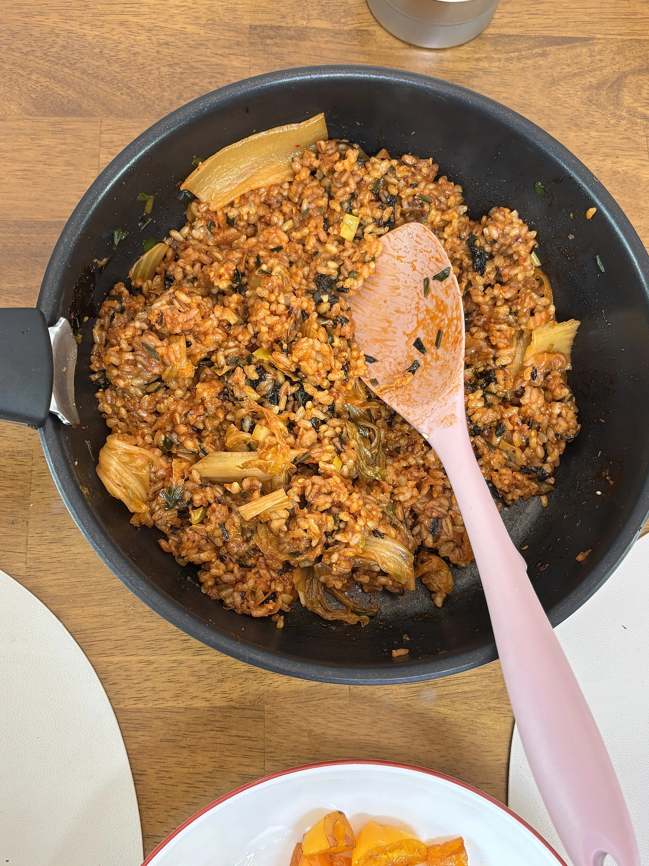 우선 들기름에 김치를 볶는다고 했다. 김치는 오래된 김치여야 한다. 이때 넣고 싶은 다른 재료들을 함께 넣는데, 고추장을 꼭 넣는 것이 포인트란다. 그렇게 들기름에 재료들을 볶다가 김치가 주황색이 되면 밥을 넣고 섞는다. 굴소스는 넣지 않는단다. 그렇게 김치볶음밥의 모습이 만들어지면 깨를 뿌려서 완성한다. 취향에 따라 계란프라이를 올린다.