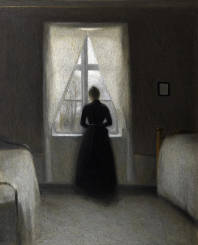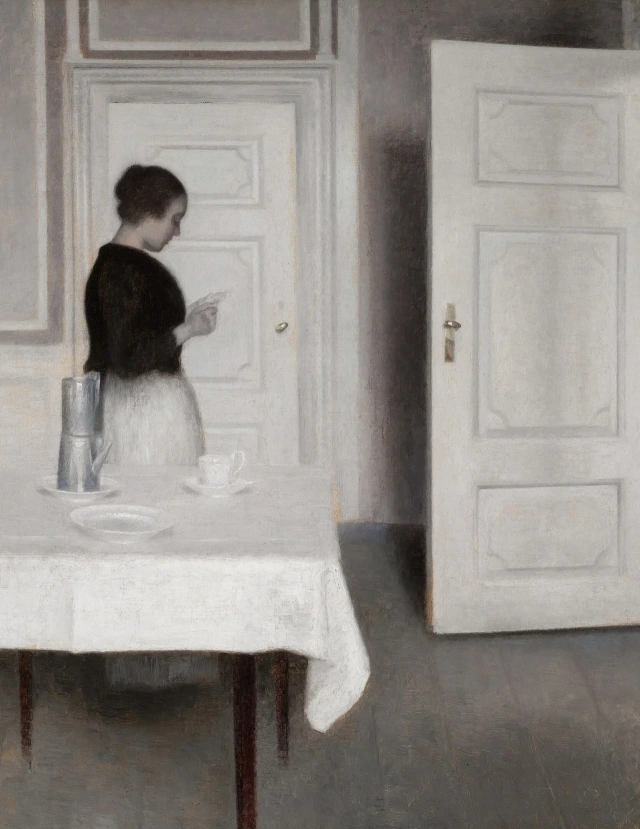 하메르스회는 마침내 되찾은 평화를 만끽하는 이다를 화폭에 옮겨 담았다. 티끌만 폴폴 떠다닐 것 같은, 정적과 평온만이 넘실대는 작품이었다. 그런데, 보다보면 이 그림에는 다른 화가들의 작품에선 쉽게 찾을 수 없는 특별한 힘이 있다는 걸 알 수 있다. 그것은 압도적인 몰입감이다.